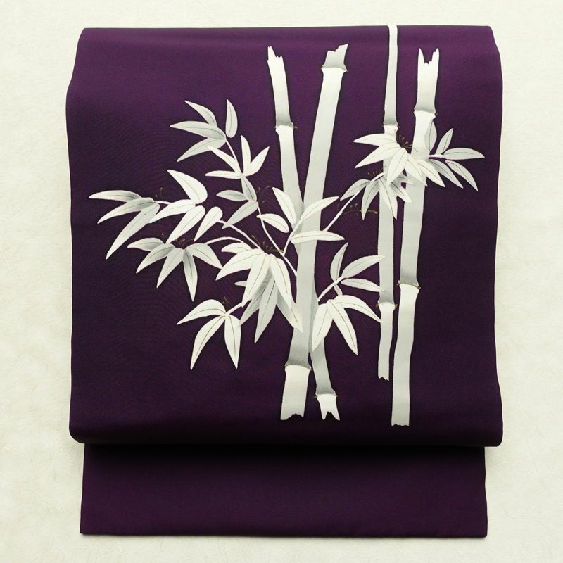 上品な紫色に笹や竹を描いた太鼓柄名古屋帯です。さらりとした正絹の風合いが心地よく、通年通して活躍します。名古屋仕立てで使いやすく、シンプルながら和の美しさを感じるデザインが特徴です。季節を問わずさりげない和の装いを楽しめます。