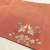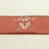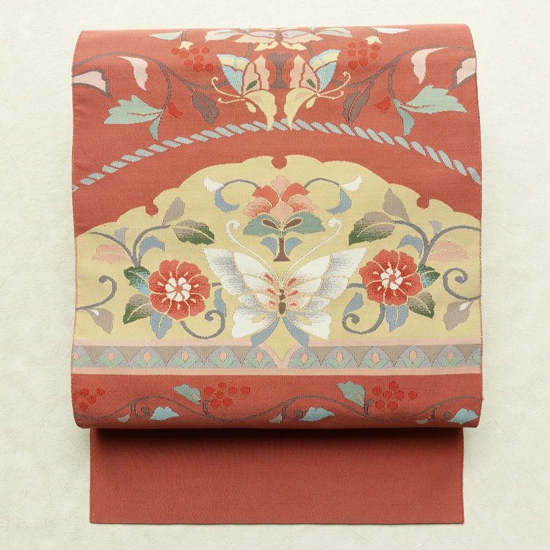 落ち着いたピンク地に蝶の意匠を配した、つづれ織の名古屋帯です。張りのあるしっかりとした正絹素材が美しい太鼓柄を保ちます。繊細な織りと優雅なモチーフが装いに品格を加え、松葉仕立てで軽やかに締められます。幅広い場面におすすめの一品です。
