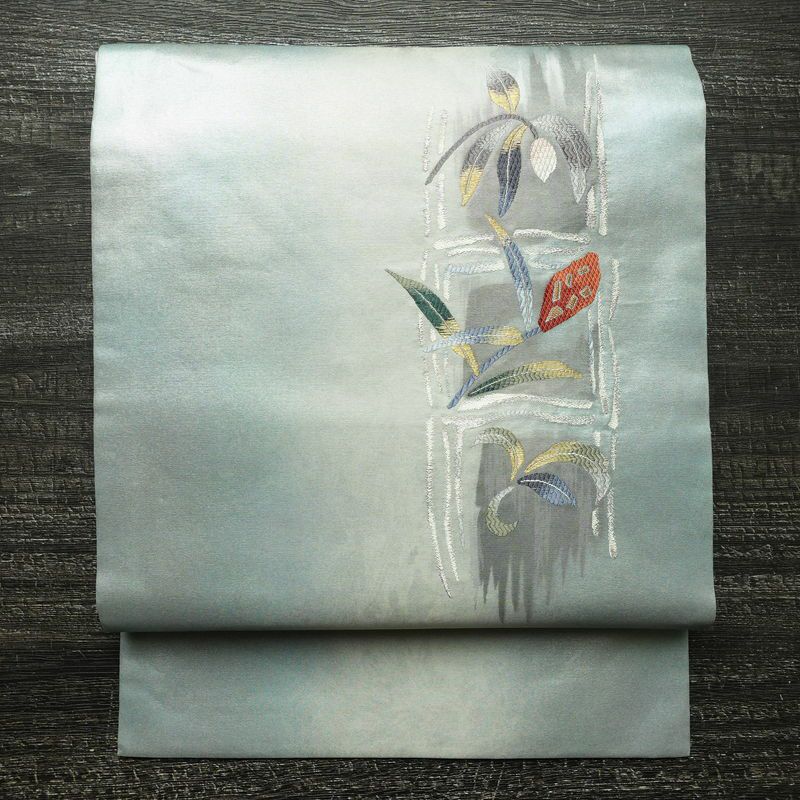 ブルーグレーのグラデーションが美しく、花柄が洗練された印象を与える太鼓柄の名古屋帯です。モダンな配色と滑らかな正絹の質感が魅力で、上品な着こなしを叶えます。名古屋仕立てで使いやすく、幅広いシーンで活躍する一品です。