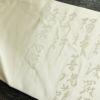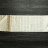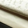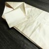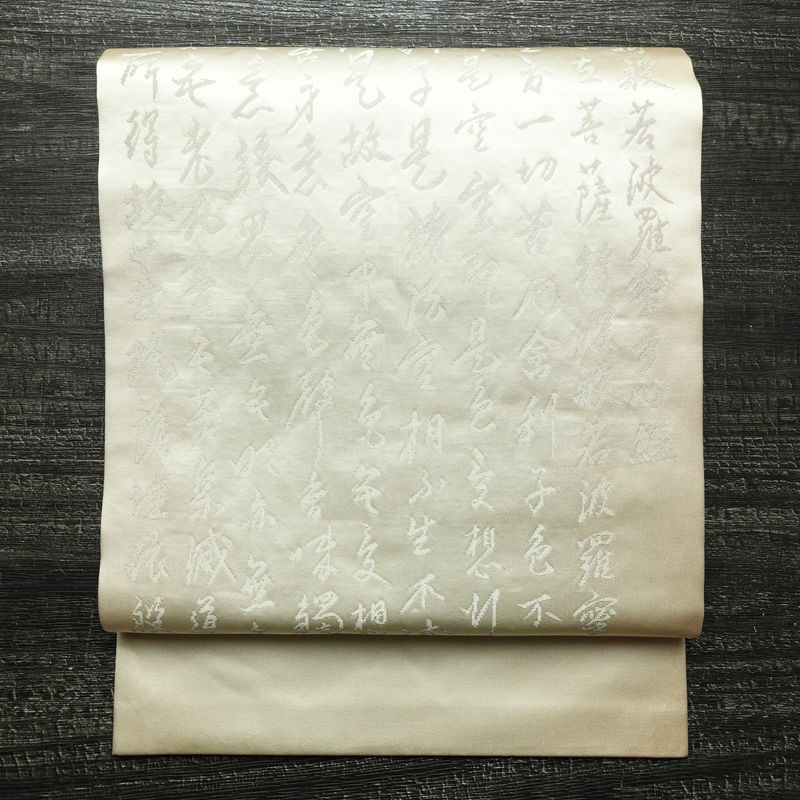 般若心経の文様を繊細にあしらったアイボリー色の名古屋帯です。正絹ならではの滑らかな風合いが魅力で、精神性を感じさせる和の趣が装いに深みを加えます。