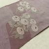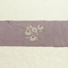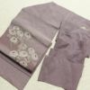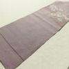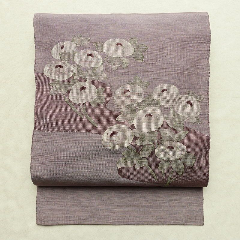 やわらかなソフト感のある正絹素材を用いた紫・藤色の花柄名古屋帯です。女性らしい上品な色合いと柄が調和し、日常からおしゃれ着まで幅広く活躍します。締め心地も軽やかで、長時間でも快適です。
