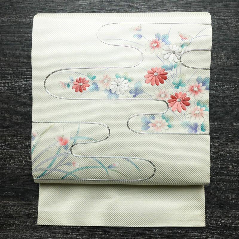 名古屋帯 太鼓柄 美品 正絹 花柄 名古屋仕立て なごや帯 リサイクル帯 帯 刺繍 菊 クリームです。こしのある風合いとなっております。