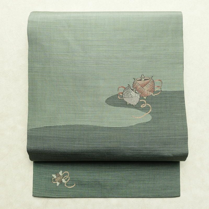 名古屋帯 太鼓柄 良品 正絹 その他の柄 名古屋仕立て なごや帯 リサイクル帯 帯 モダン シンプル 緑・うぐいす色です。心地よい風合いとなっております。
