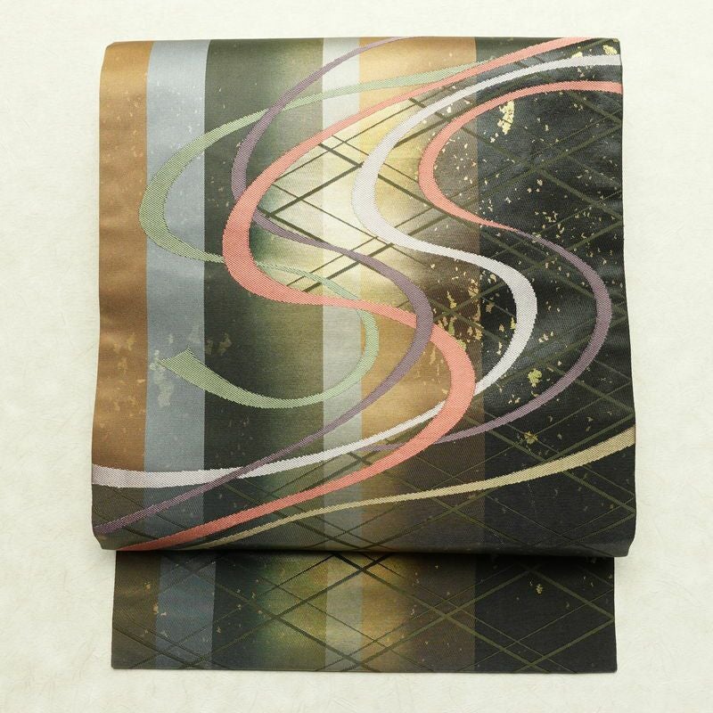 名古屋帯 太鼓柄 良品 正絹 幾何学柄・抽象柄 名古屋仕立て なごや帯 ロマネスク リサイクル帯 帯 箔 多色使いです。心地よい風合いとなっております。