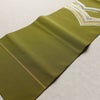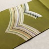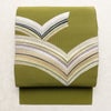 名古屋帯 太鼓柄 つづれ織 正絹 幾何学柄・抽象柄 松葉仕立て なごや帯 リサイクル帯 帯 金糸 銀糸 モダン シンプル 緑・うぐいす色です。パリッとした風合いとなっております。