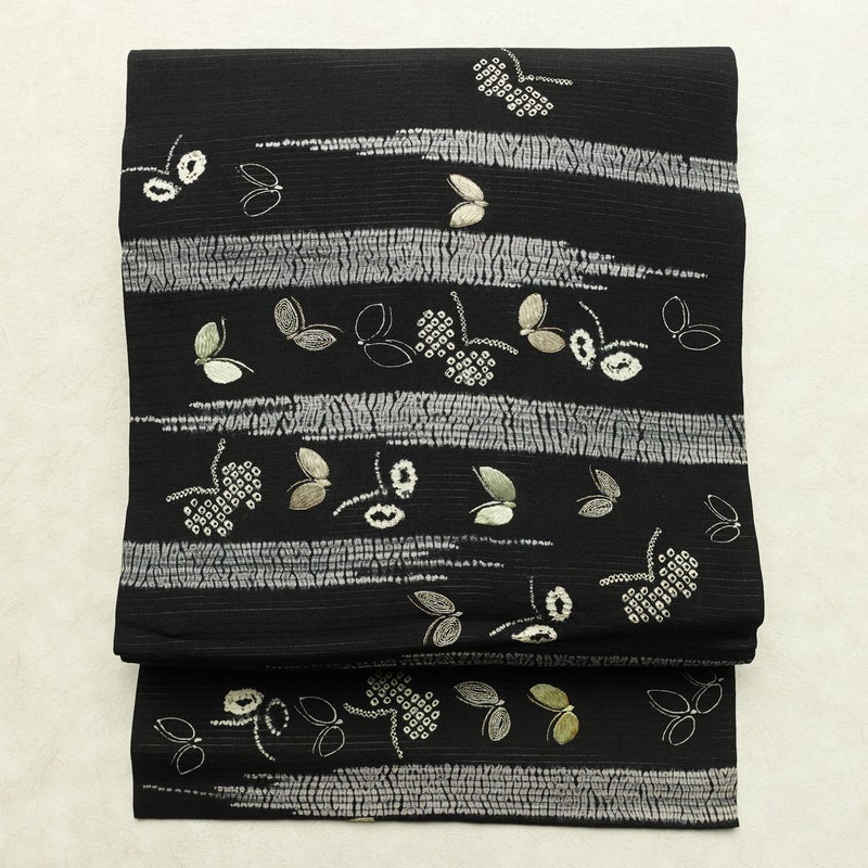 名古屋帯 太鼓柄 絞り 正絹 蝶・昆虫柄 名古屋仕立て なごや帯 リサイクル帯 帯 刺繍 黒です。さらりとした風合いとなっております。
