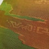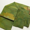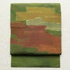 名古屋帯 太鼓柄 正絹 幾何学柄・抽象柄 名古屋仕立て なごや帯 リサイクル帯 ポケット付き 帯 紬地 緑・うぐいす色です。心地よい風合いとなっております。