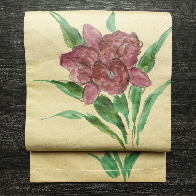 名古屋帯 太鼓柄 正絹 花柄 名古屋仕立て なごや帯 リサイクル帯 帯 クリームです。こしのある風合いとなっております。