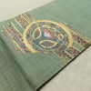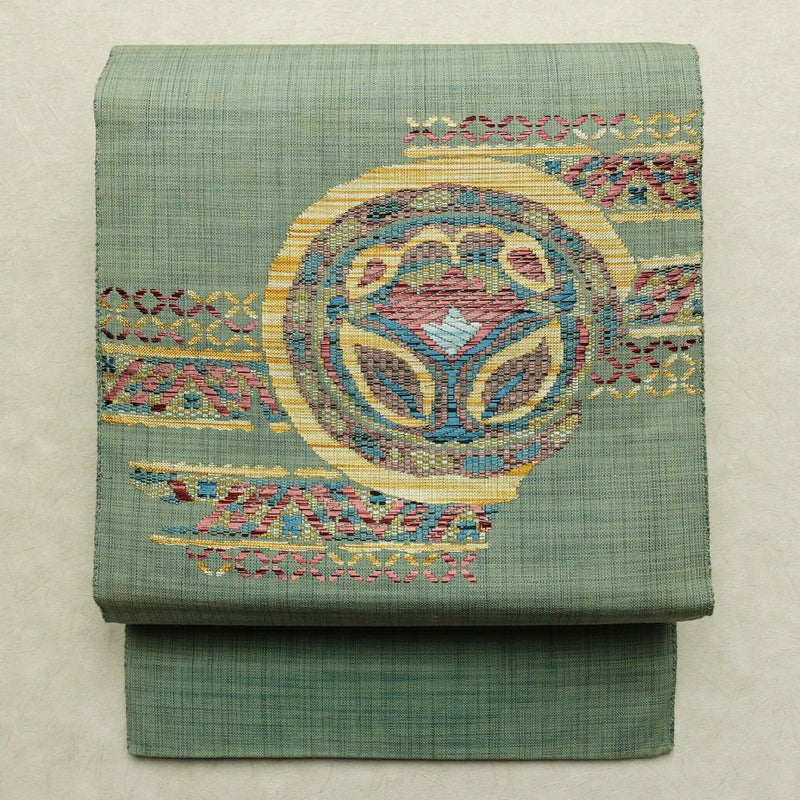 名古屋帯 太鼓柄 正絹 幾何学柄・抽象柄 松葉仕立て なごや帯 リサイクル帯 帯 緑・うぐいす色です。ざっくりとした風合いとなっております。