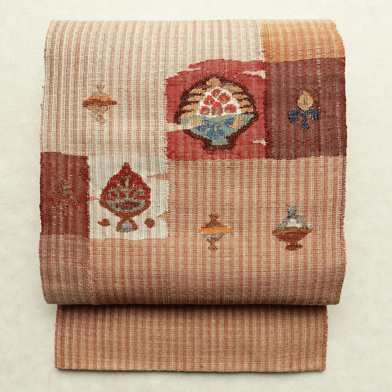 名古屋帯 太鼓柄 美品 正絹 幾何学柄・抽象柄 松葉仕立て なごや帯 リサイクル帯 帯 モダン ピンクです。ざっくりとした風合いとなっております。