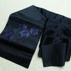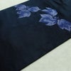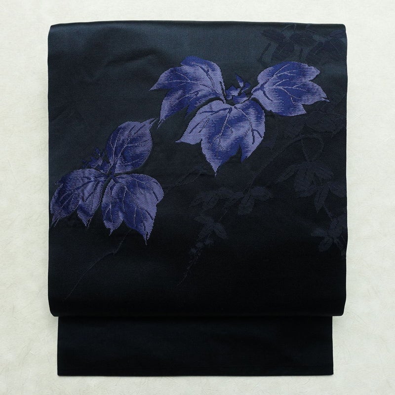 名古屋帯 太鼓柄 正絹 木の葉・植物柄 名古屋仕立て なごや帯 リサイクル帯 帯 シンプル 青・紺です。滑らかな風合いとなっております。