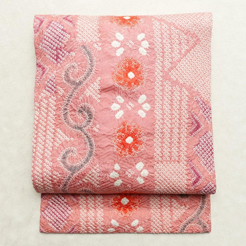 名古屋帯 太鼓柄 美品 絞り 総絞り 正絹 古典柄 名古屋仕立て なごや帯 リサイクル帯 帯 ピンクです。心地よい風合いとなっております。