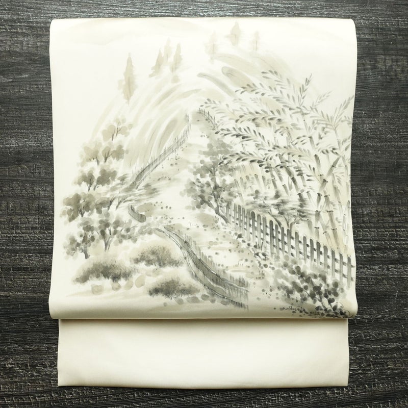 名古屋帯 太鼓柄 良品 落款入り 正絹 風景柄 名古屋仕立て なごや帯 リサイクル帯 帯 白です。さらりとした風合いとなっております。