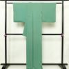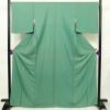 薄い緑色地に植物柄を控えめに配した色無地の袷着物です。正絹のしなやかな風合いで、着心地がよく上品な印象を与えます。しつけ糸付きで、リサイクル品ながら状態も良好です。