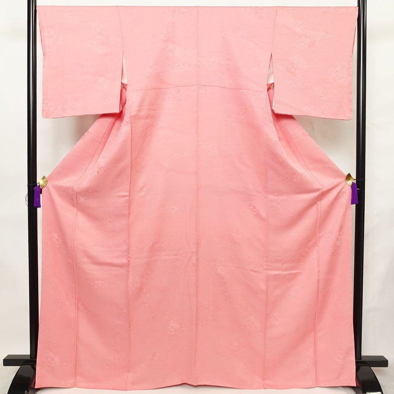 色無地 一つ紋付き 正絹 花柄 袷仕立て 身丈167.5cm 裄丈67.5cm リサイクル着物 一部しつけ糸付き 着物 お茶会 七五三 フォーマル ピンクです。心地よい風合いとなっております。