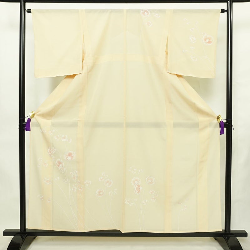 盛夏 絽 付下 良品 しつけ糸付き 正絹 花柄 単衣仕立て 身丈157.5cm 裄丈63.5cm リサイクル着物 着物 銀彩 薄物 フォーマル ベージュです。さらりとした風合いとなっております。