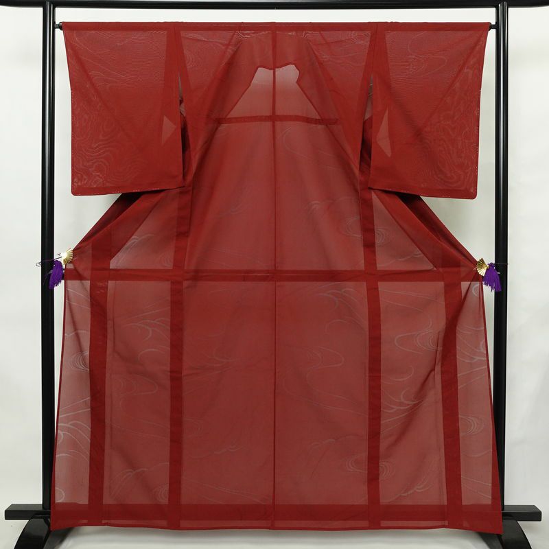 落ち着いた色合いに流水柄をあしらった盛夏用の紗着物です。正絹薄物素材でさらりとした風合いが特徴で、軽やかに着られます。しつけ糸付きで、リサイクル品としても状態良好です。華やかで涼しげな装いにおすすめです。