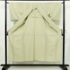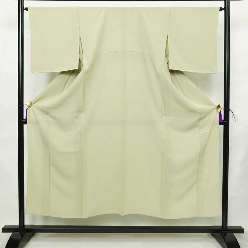 単衣 色無地 良品 しつけ糸付き 縮緬 一つ紋付き 正絹 無地 袷仕立て 身丈150cm 裄丈64.5cm リサイクル着物 着物 お茶会 フォーマル 緑・うぐいす色です。しなやかな風合いとなっております。