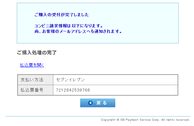 - 支払い受付が完了となり、以下の情報が表示されます。