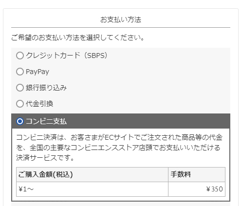 - 「お支払い方法」にて「コンビニ決済」を選択し、[注文を確定する]ボタンを押下します。