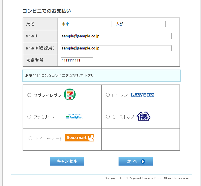 - 「お支払い情報」画面(SBPSサイト)へ遷移します。