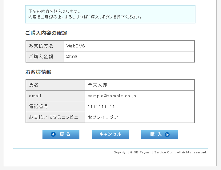 - 「お支払い方法」と「お支払い金額」「お客様情報」を確認し、[購入]ボタンを押下します。