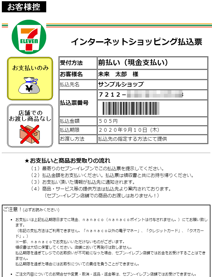 - [払込票を開く]リンクが表示され、押下すると払込票が表示されます。(セブンイレブンの場合)