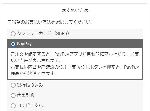 - 「お支払い方法」にて「PayPay」を選択し、[注文を確定する]ボタンを押下します。