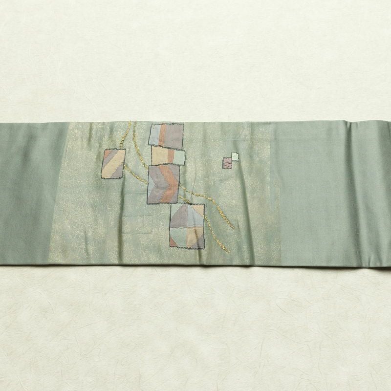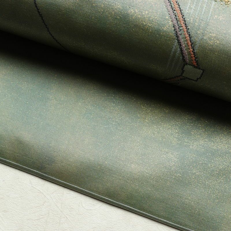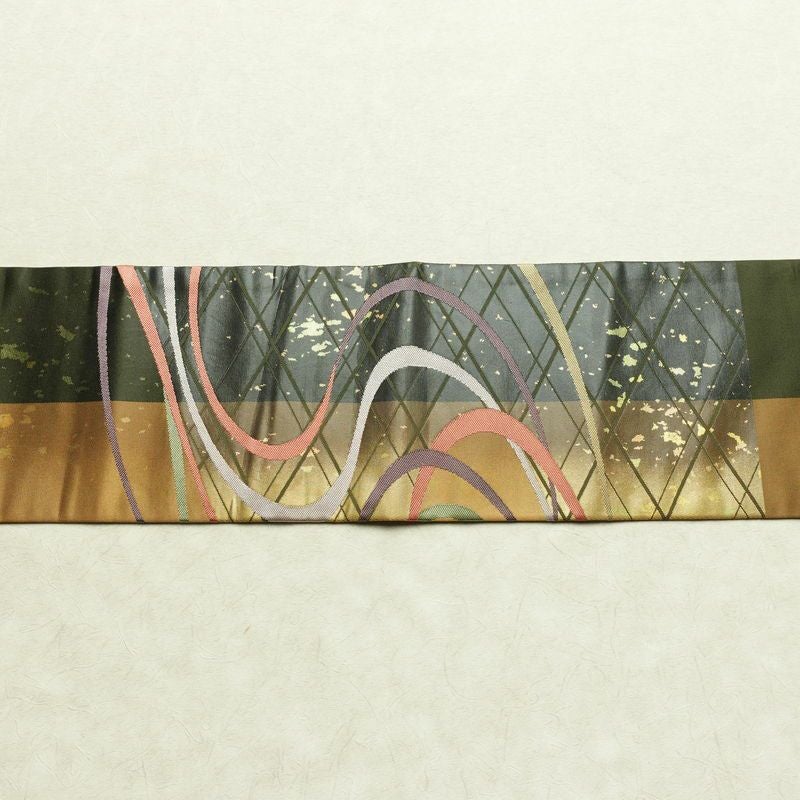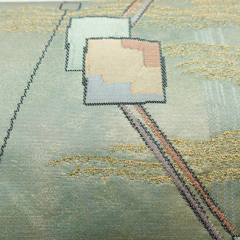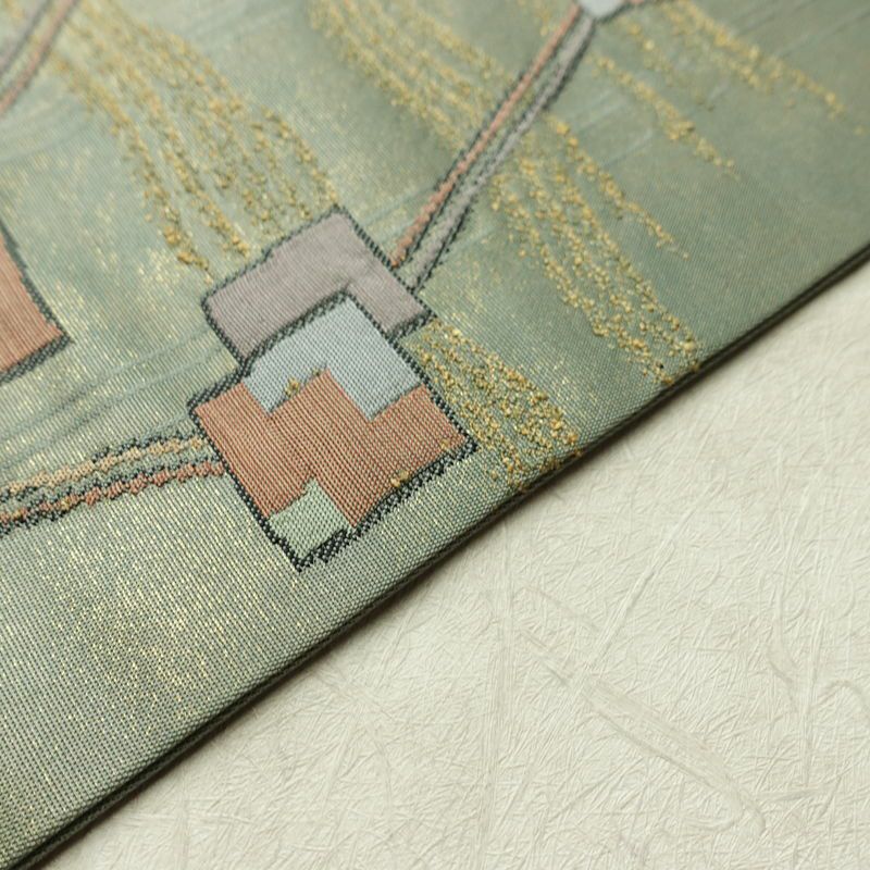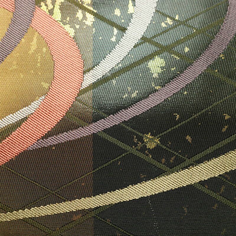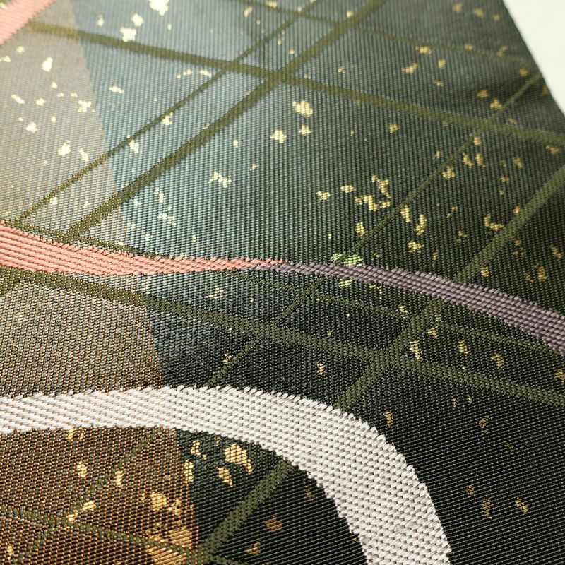 名古屋帯 太鼓柄 正絹 幾何学柄・抽象柄 名古屋仕立て なごや帯 リサイクル帯 帯 箔 モダン 緑・うぐいす色