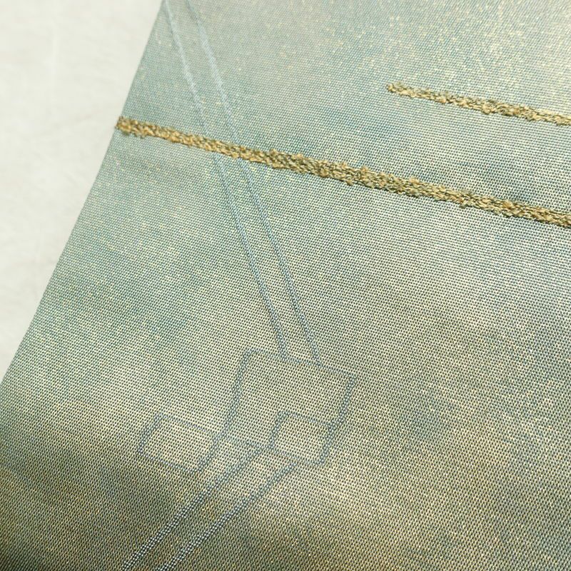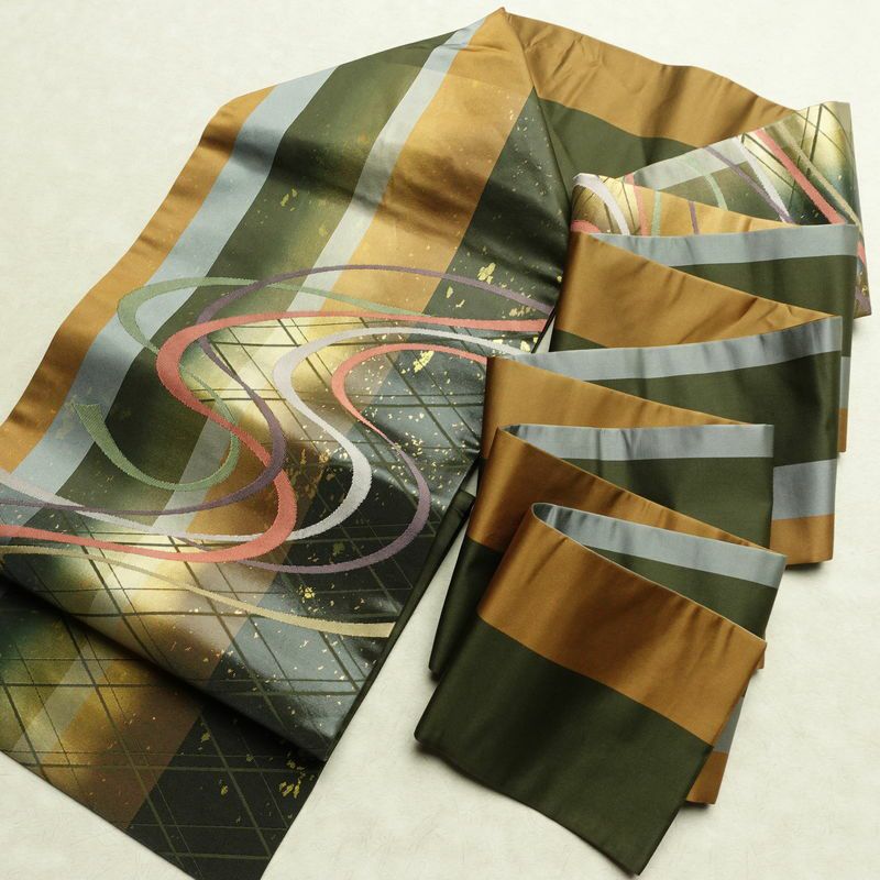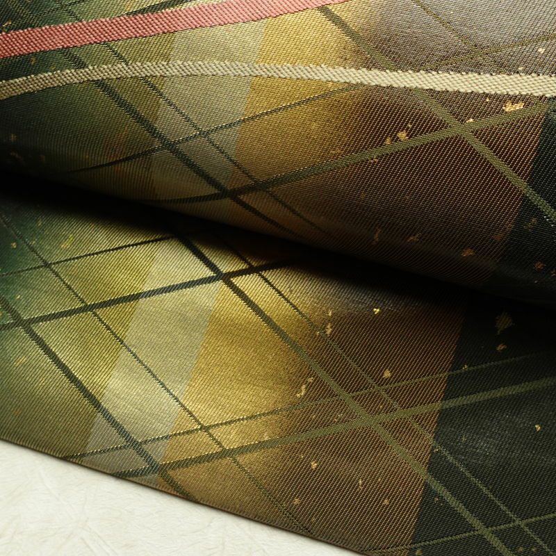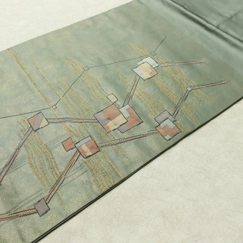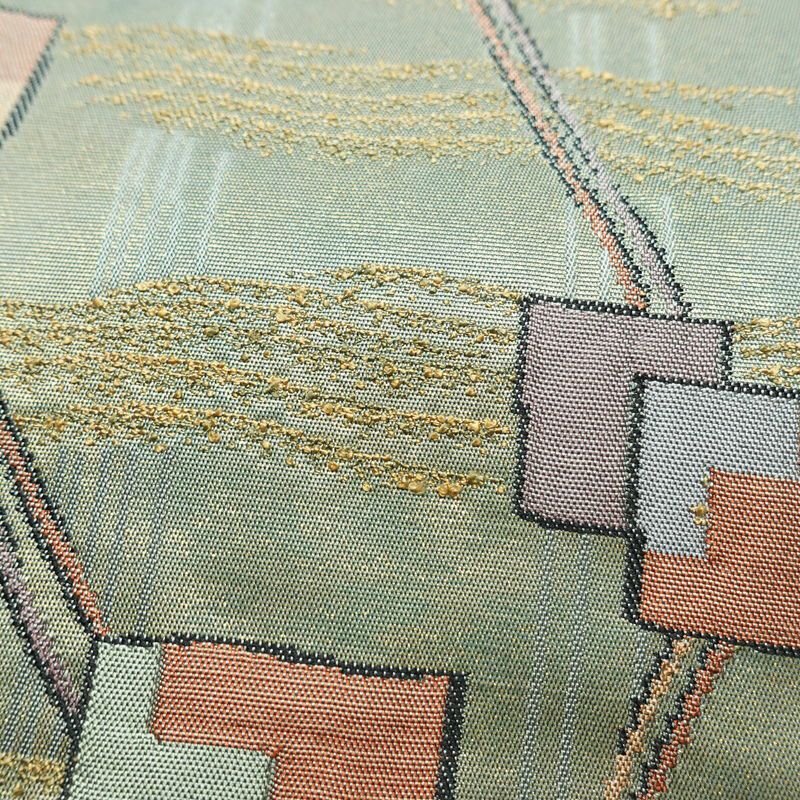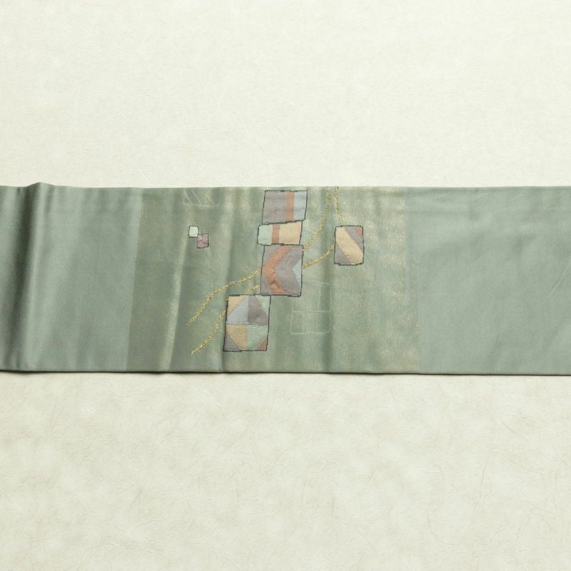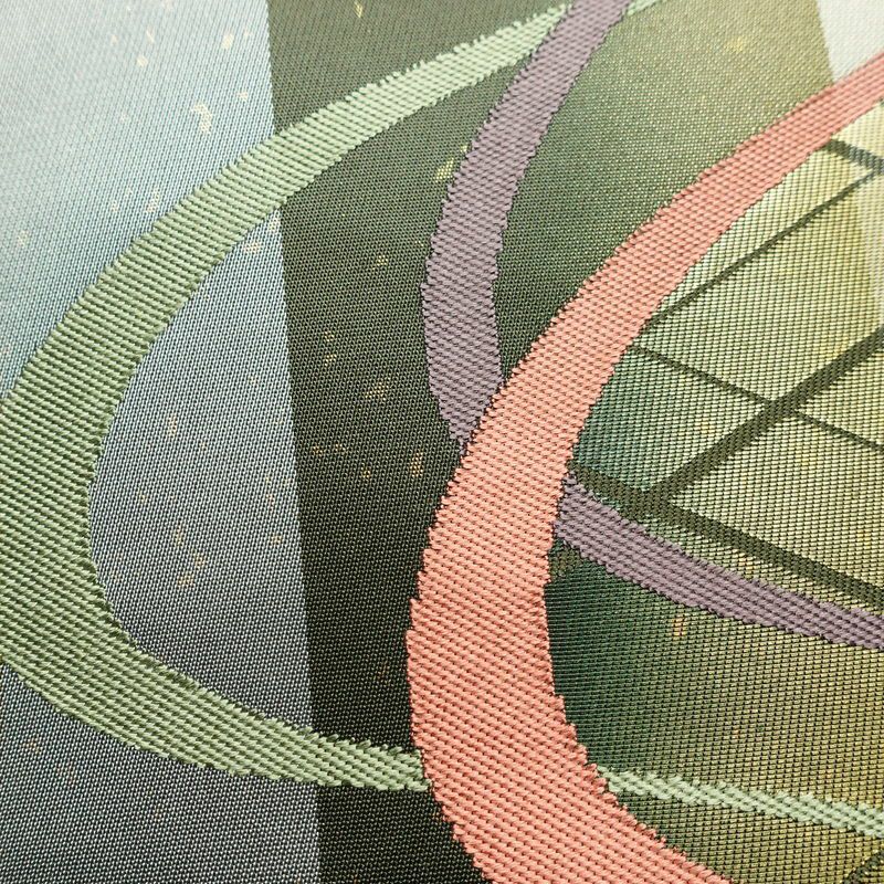 名古屋帯 太鼓柄 正絹 幾何学柄・抽象柄 名古屋仕立て なごや帯 リサイクル帯 帯 箔 モダン 緑・うぐいす色