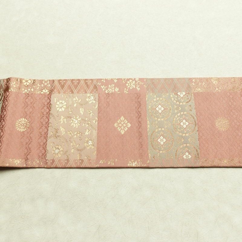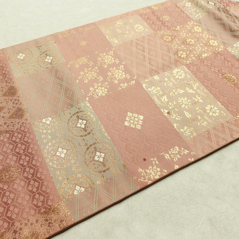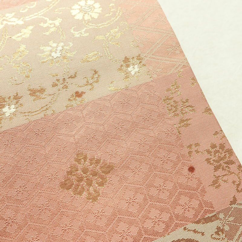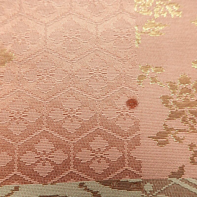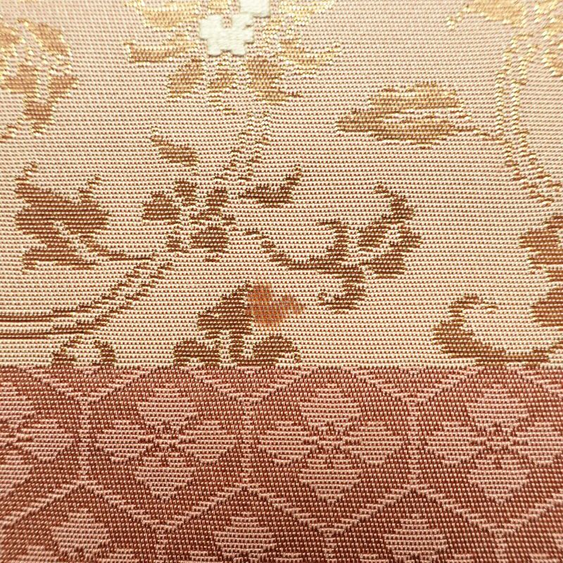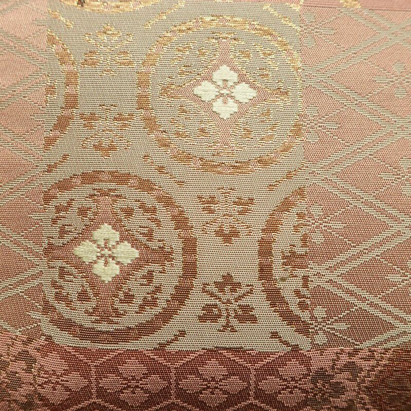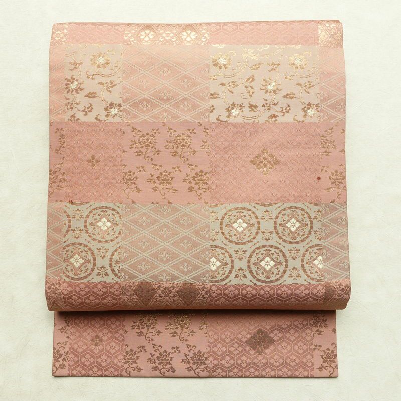 名古屋帯 六通柄 正絹 チェック・格子柄 名古屋仕立て なごや帯 リサイクル帯 帯 箔 ピンク