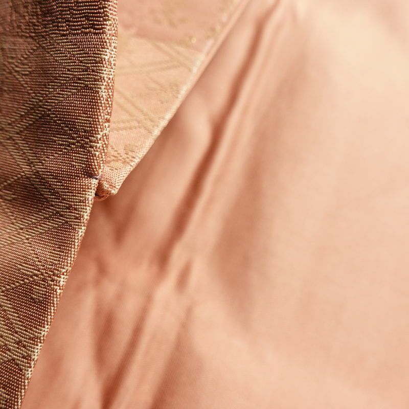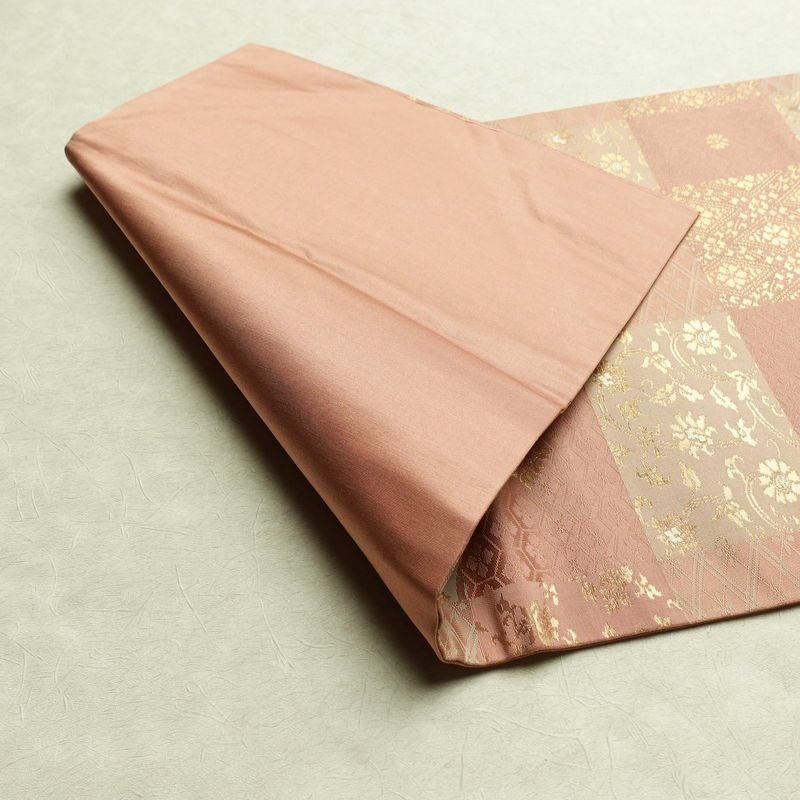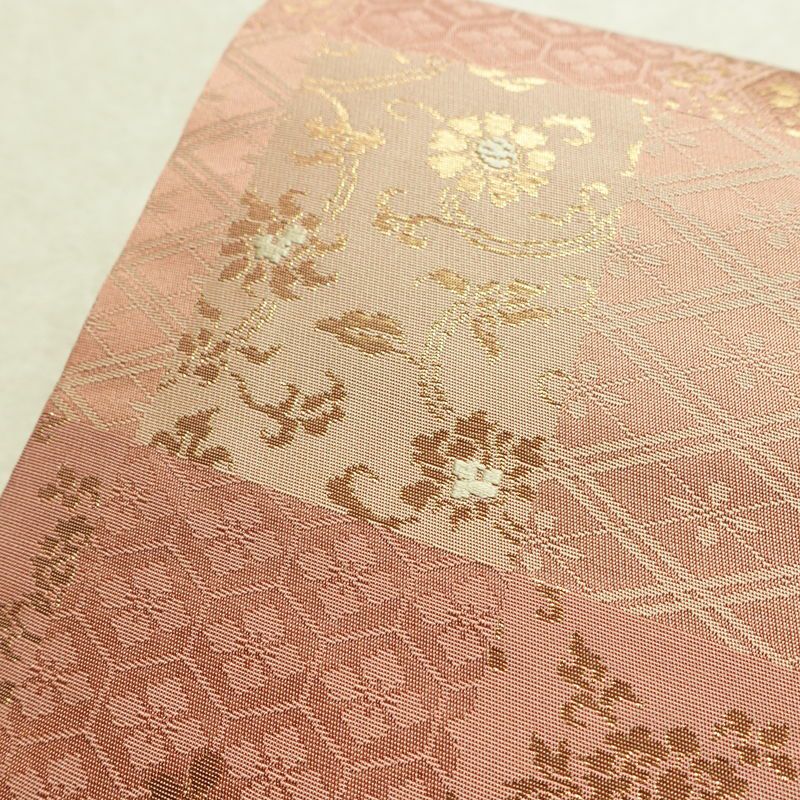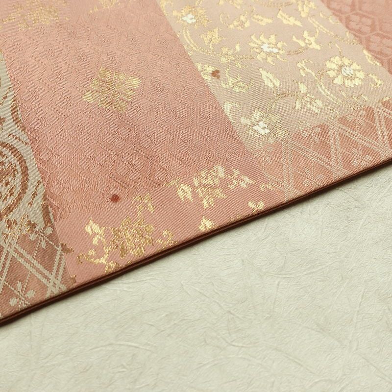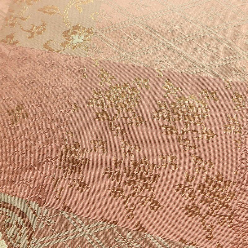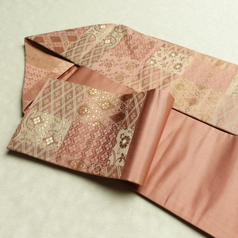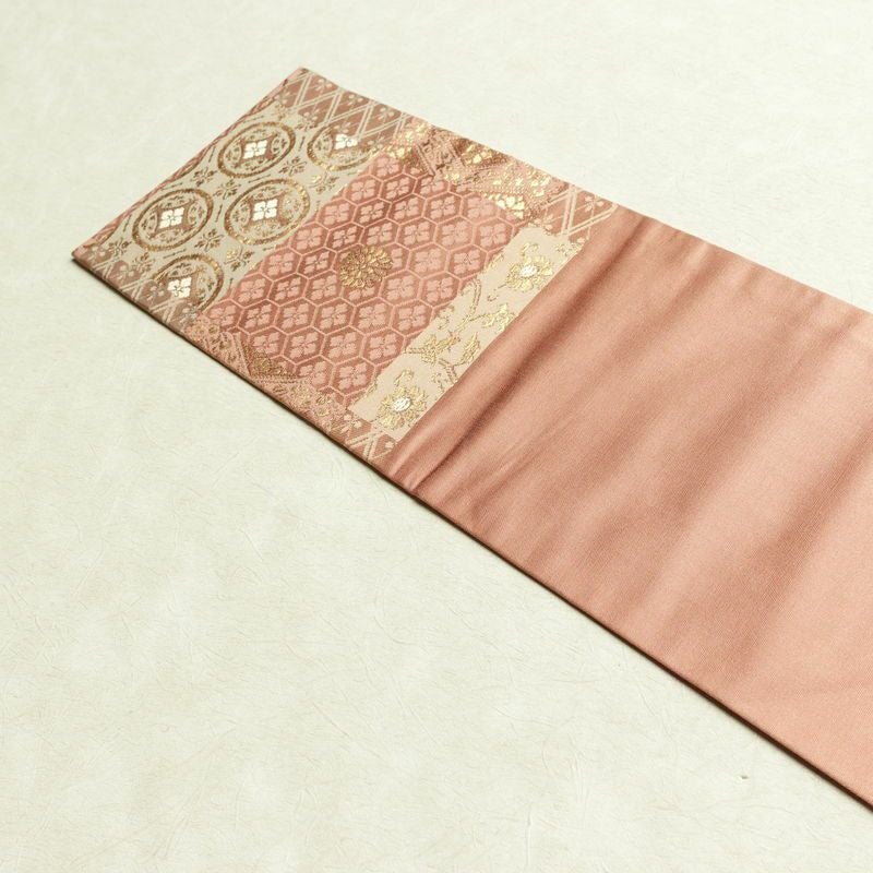 名古屋帯 六通柄 正絹 チェック・格子柄 名古屋仕立て なごや帯 リサイクル帯 帯 箔 ピンク