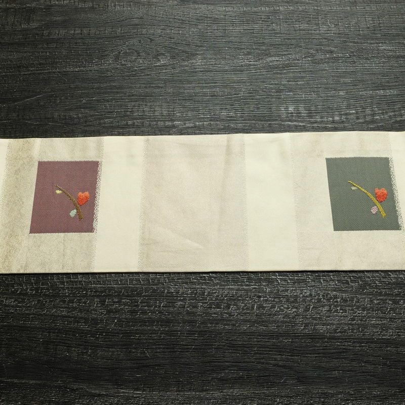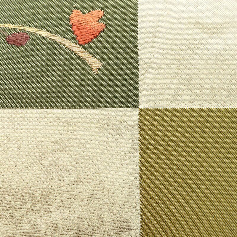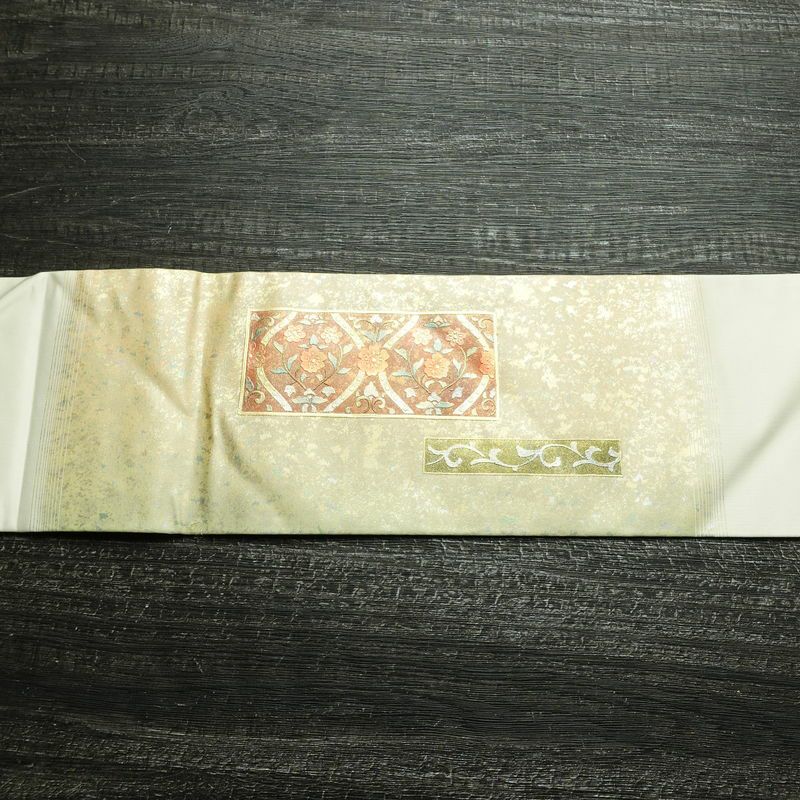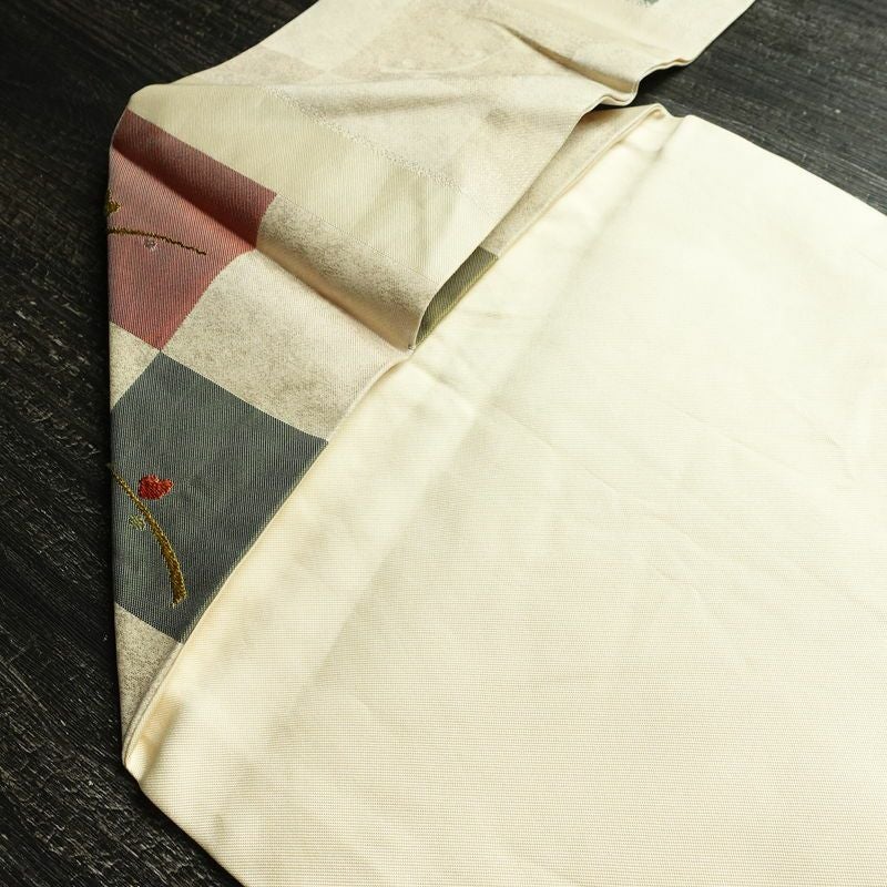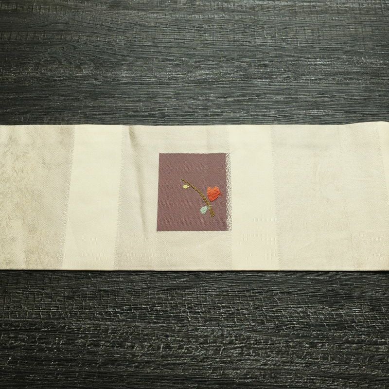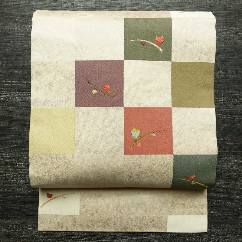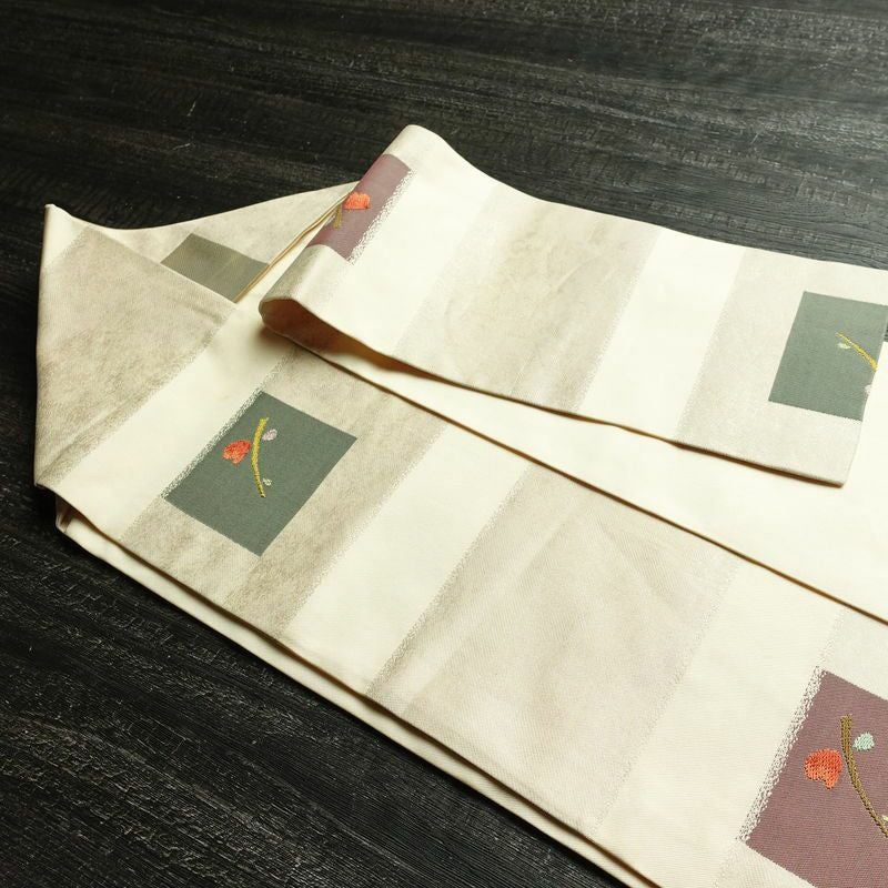 名古屋帯 六通柄 正絹 木の葉・植物柄 名古屋仕立て なごや帯 リサイクル帯 帯 モダン クリーム
