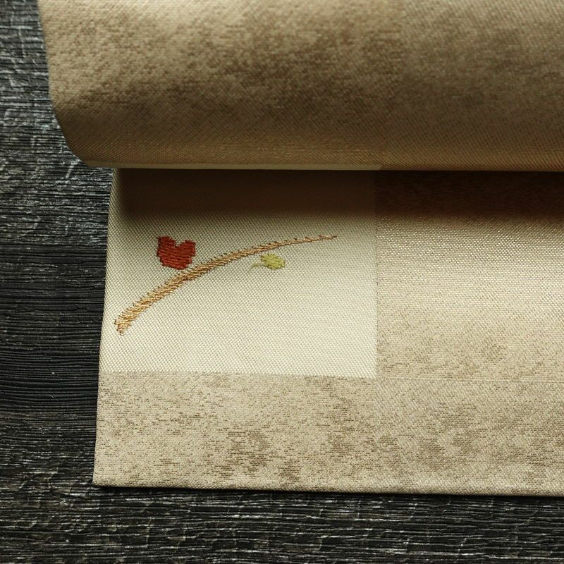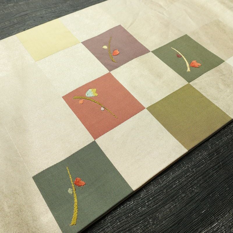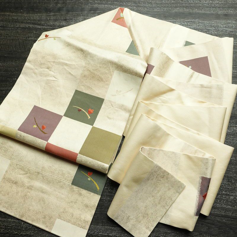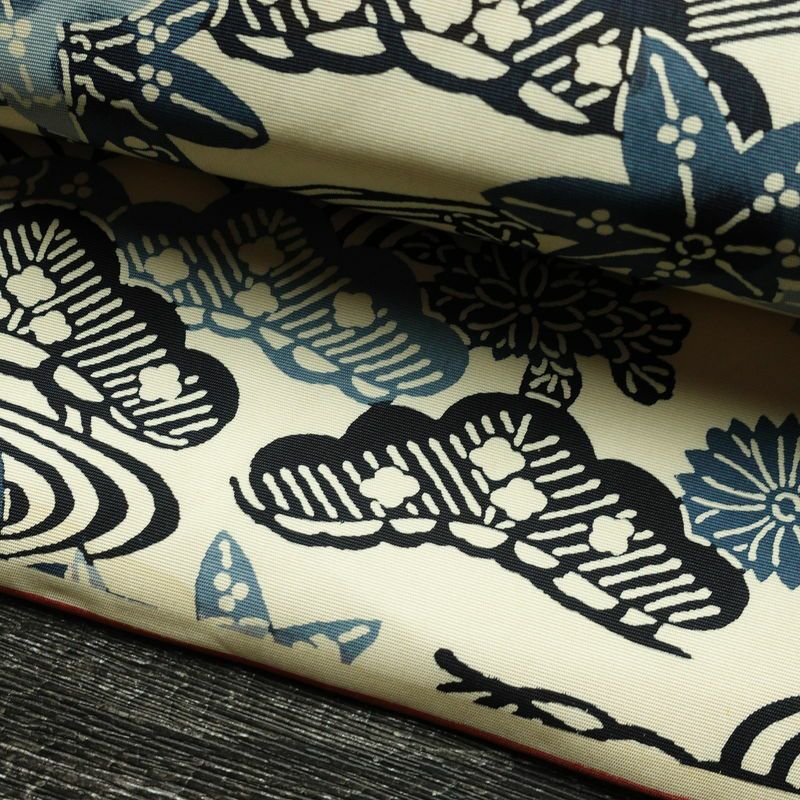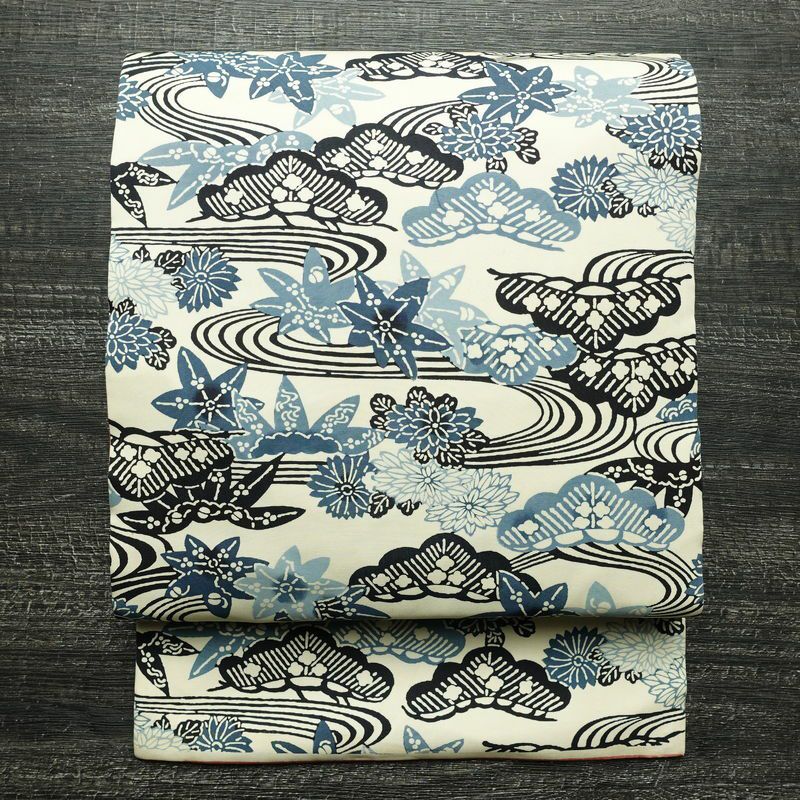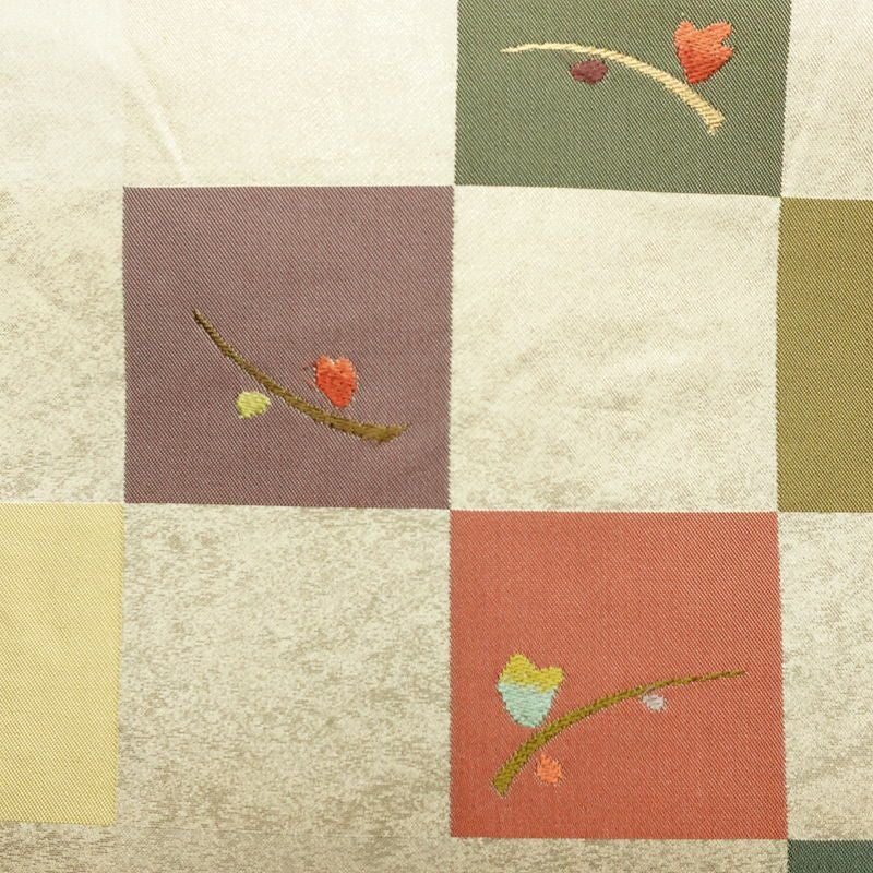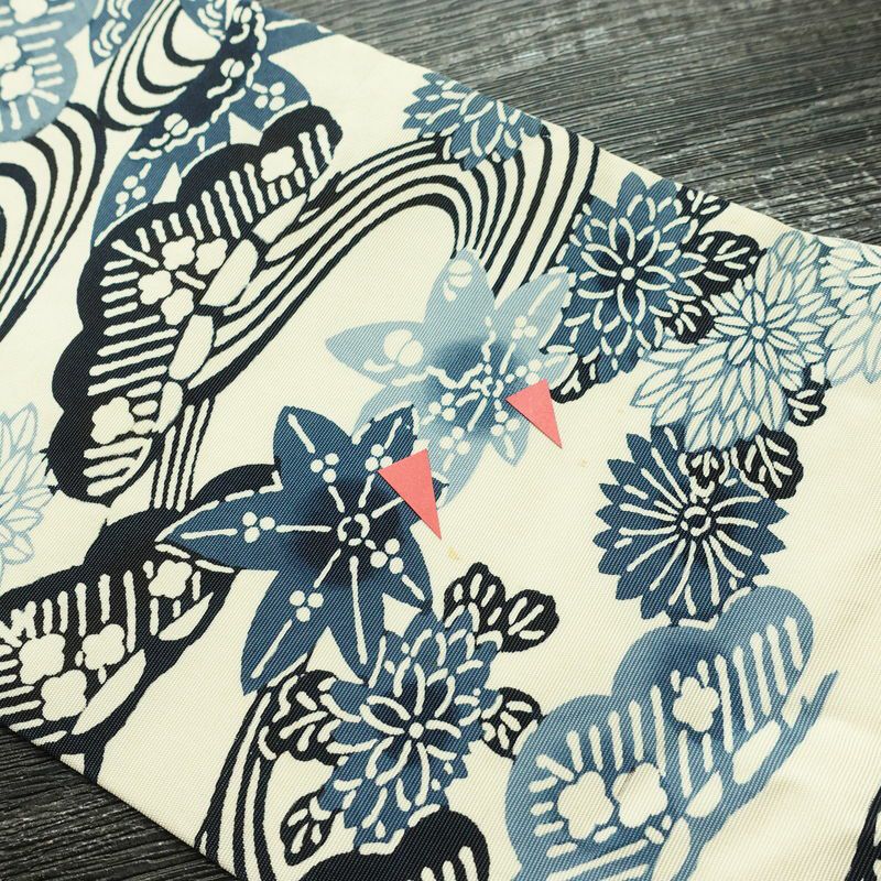 名古屋帯 六通柄 正絹 木の葉・植物柄 名古屋仕立て なごや帯 リサイクル帯 帯 モダン クリーム