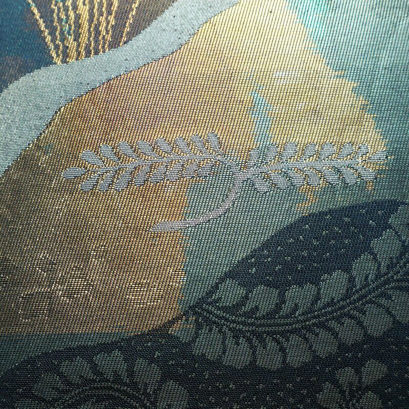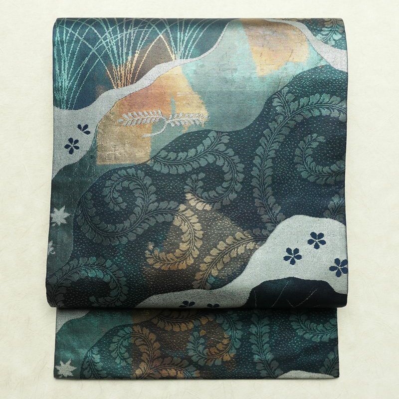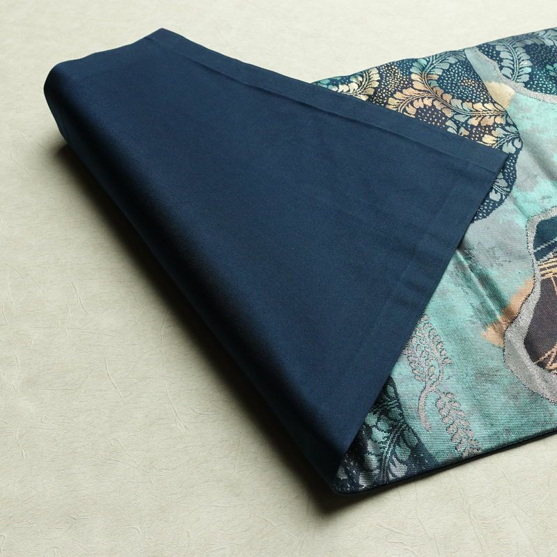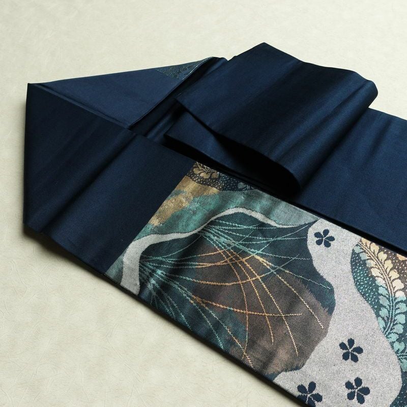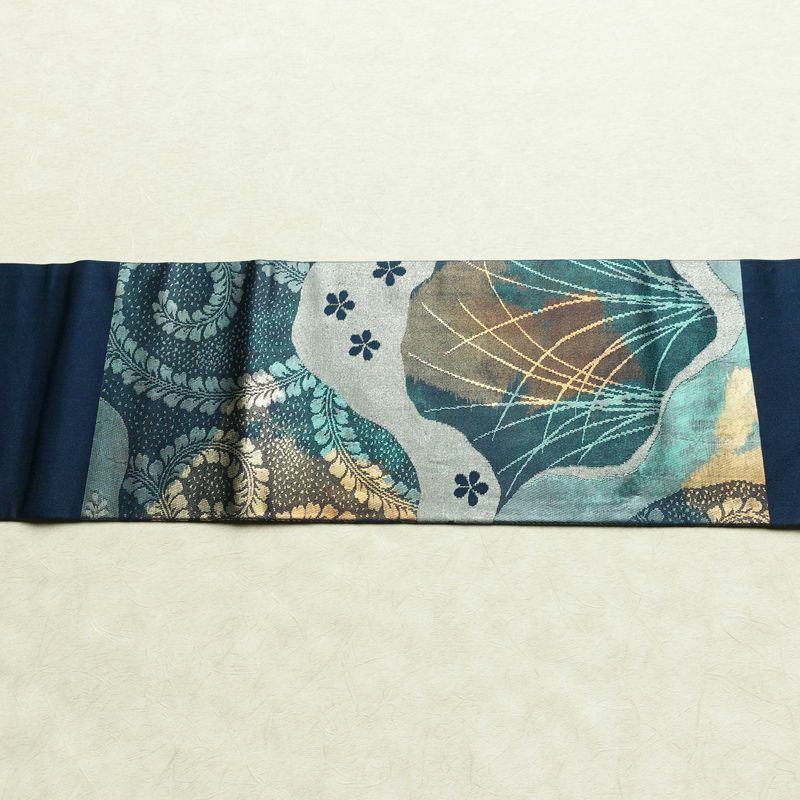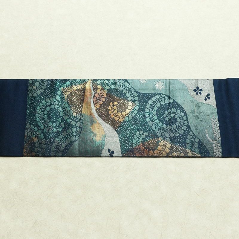 名古屋帯 太鼓柄 良品 正絹 木の葉・植物柄 名古屋仕立て なごや帯 リサイクル帯 帯 箔 青・紺