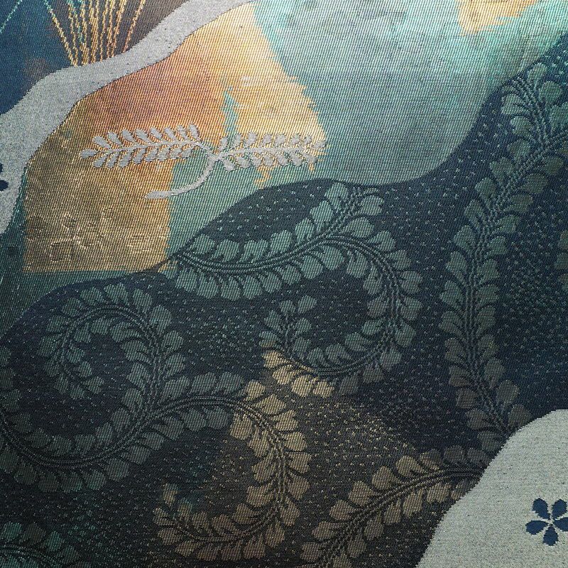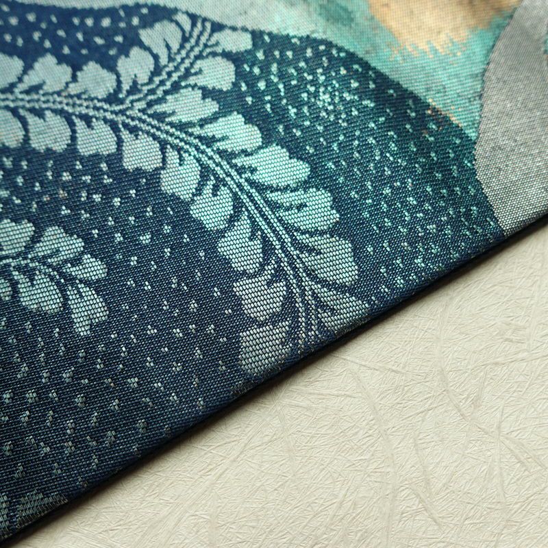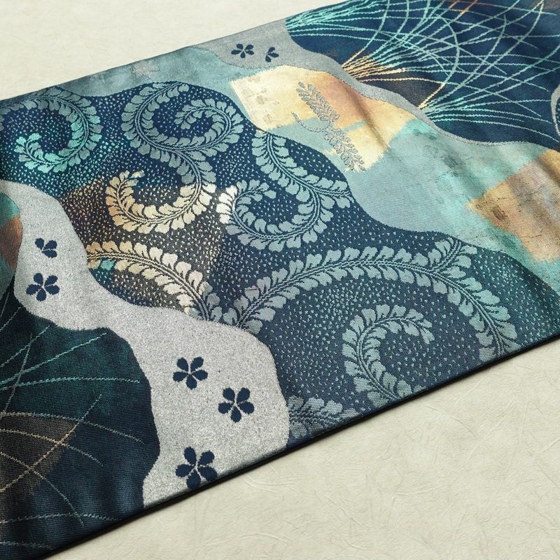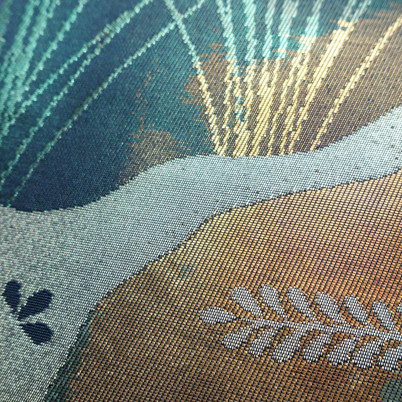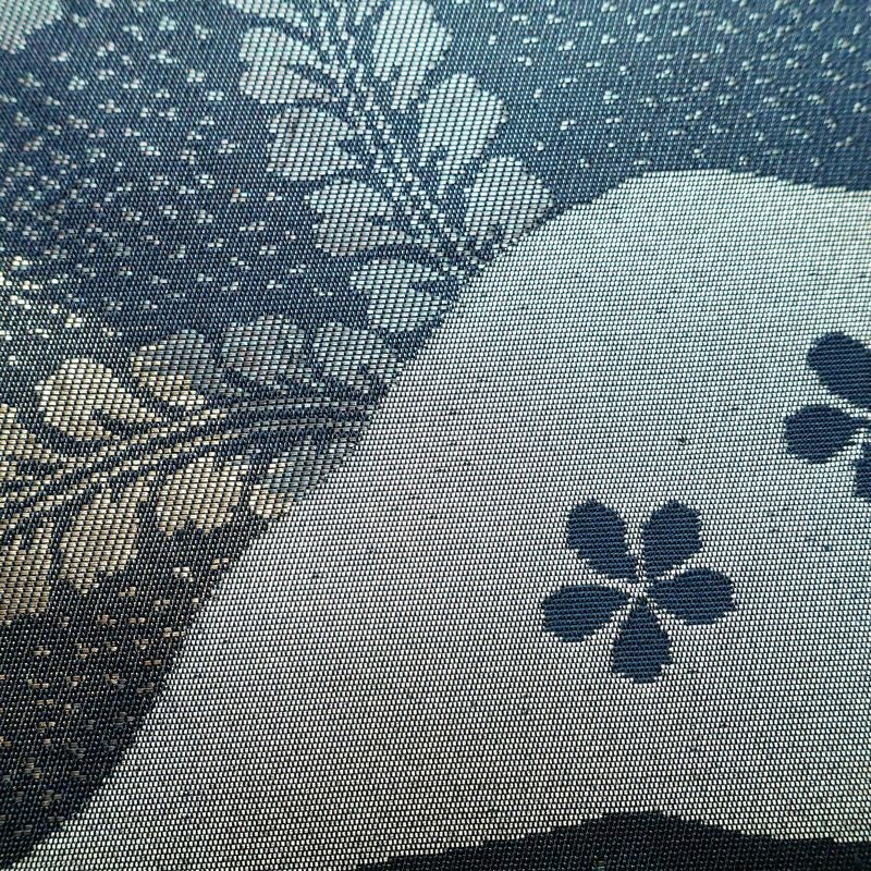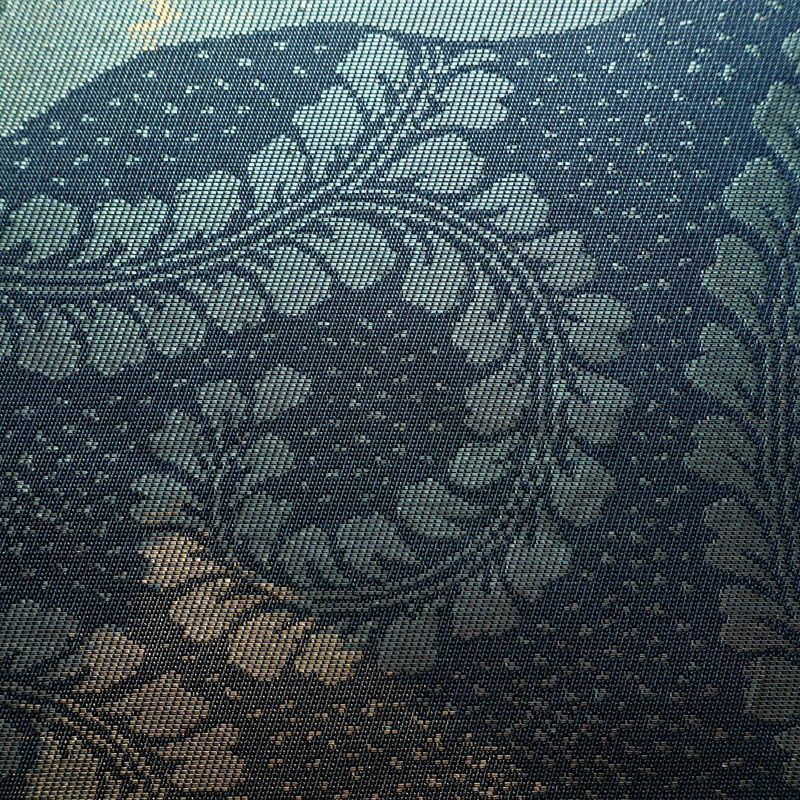 名古屋帯 太鼓柄 良品 正絹 木の葉・植物柄 名古屋仕立て なごや帯 リサイクル帯 帯 箔 青・紺