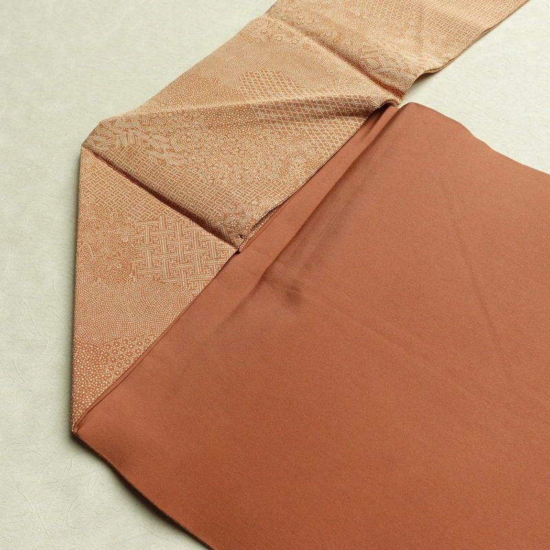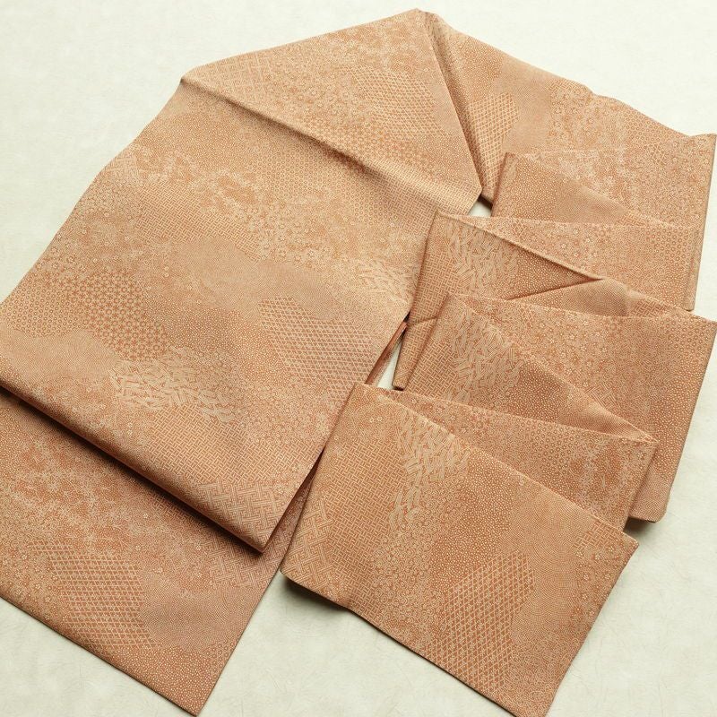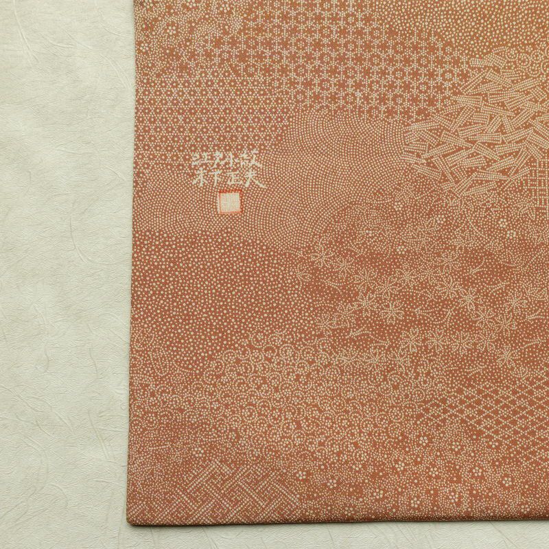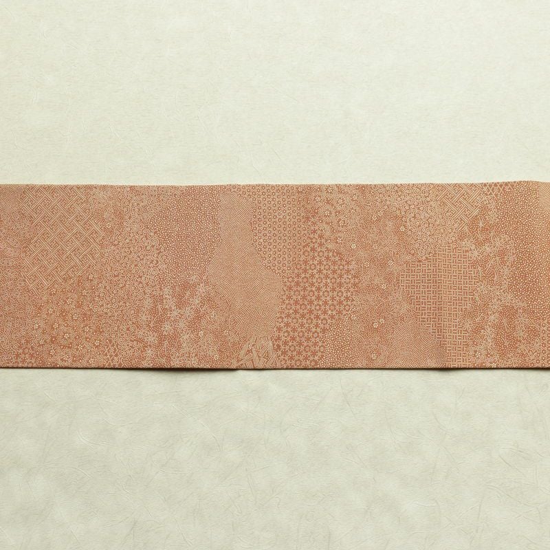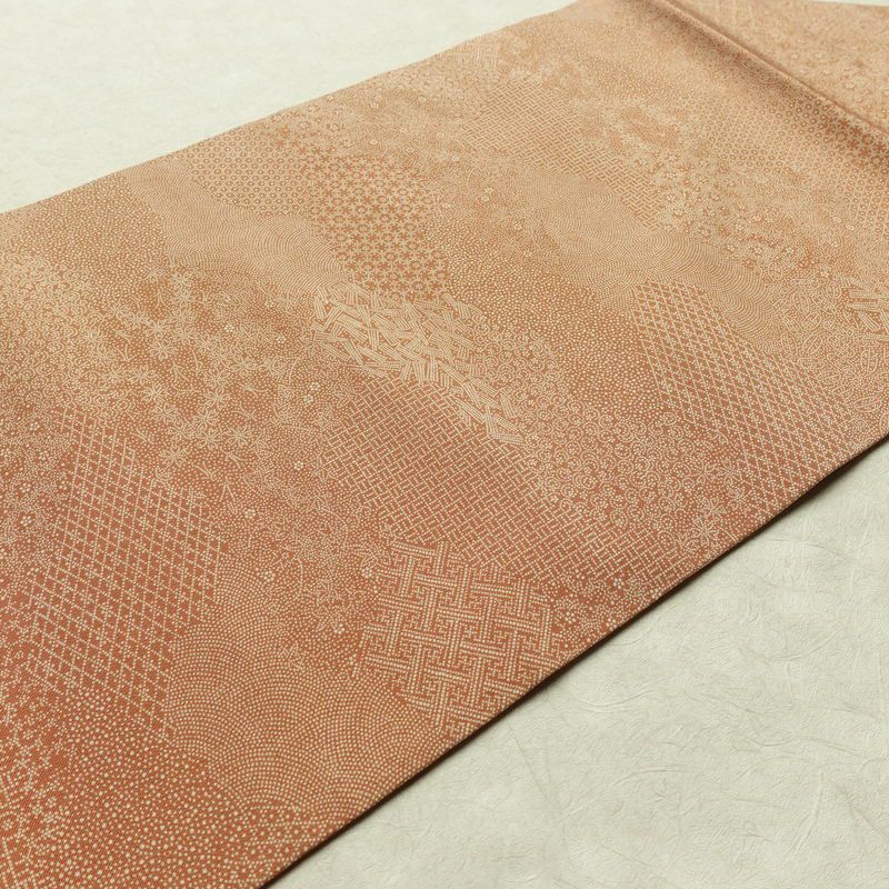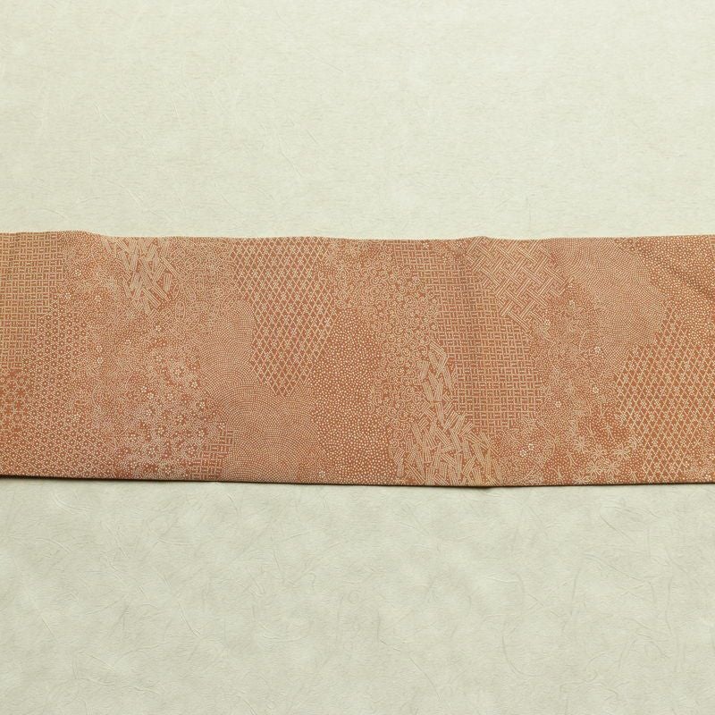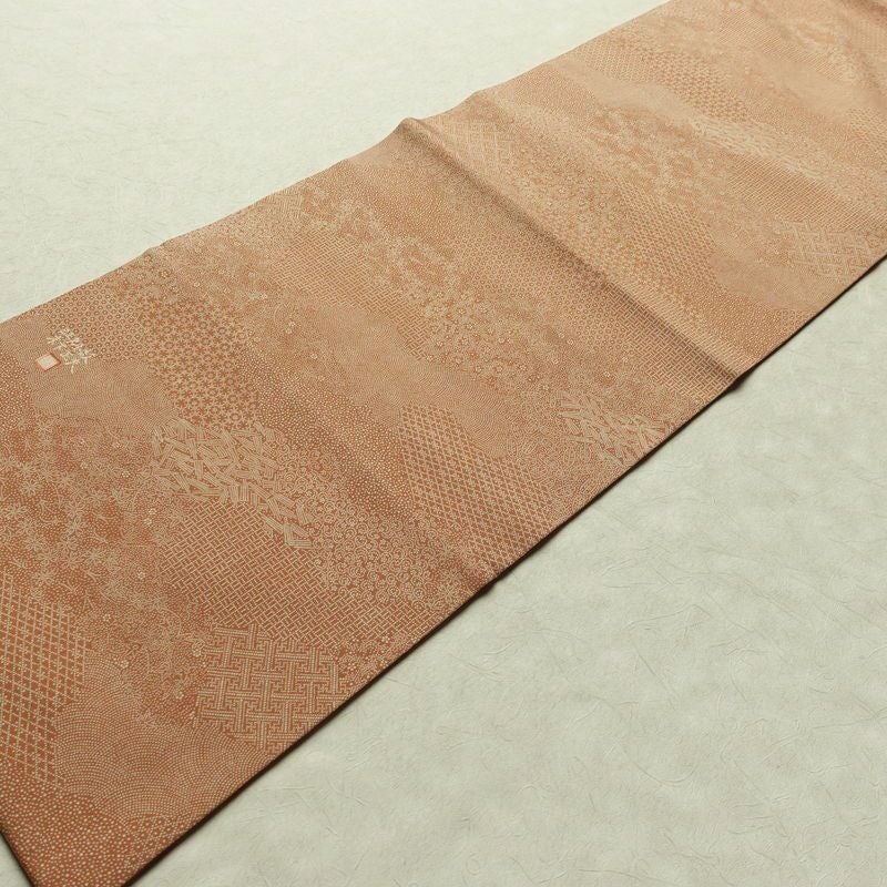 名古屋帯 全通柄 木下正夫 良品 落款入り 江戸小紋 正絹 古典柄 名古屋仕立て なごや帯 リサイクル帯 帯 茶