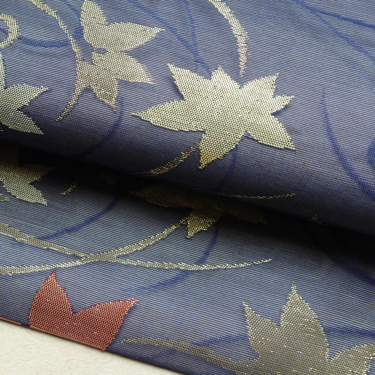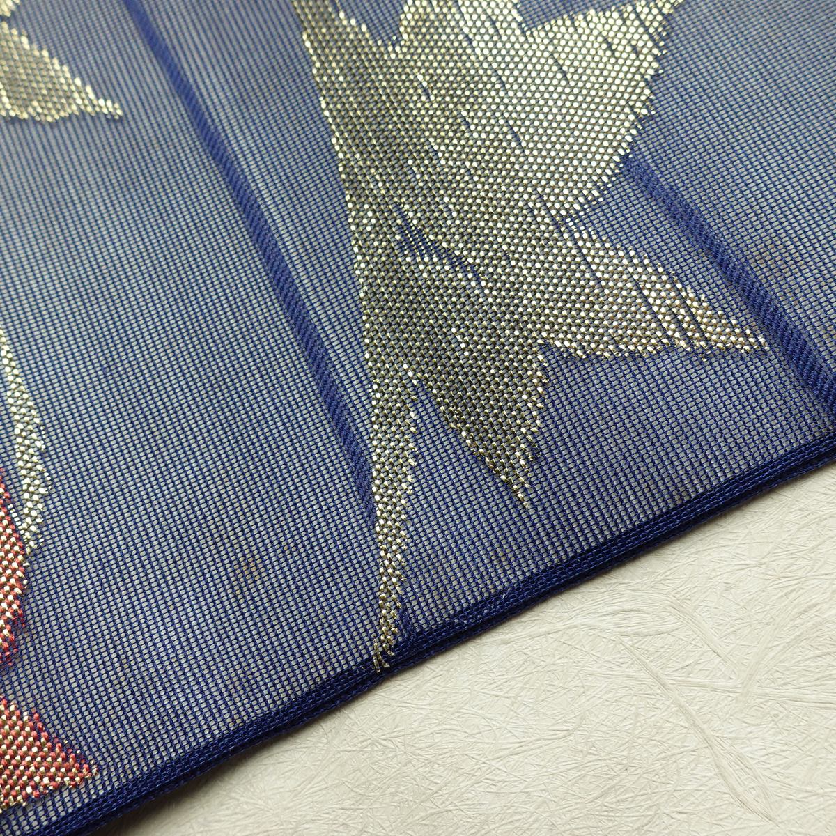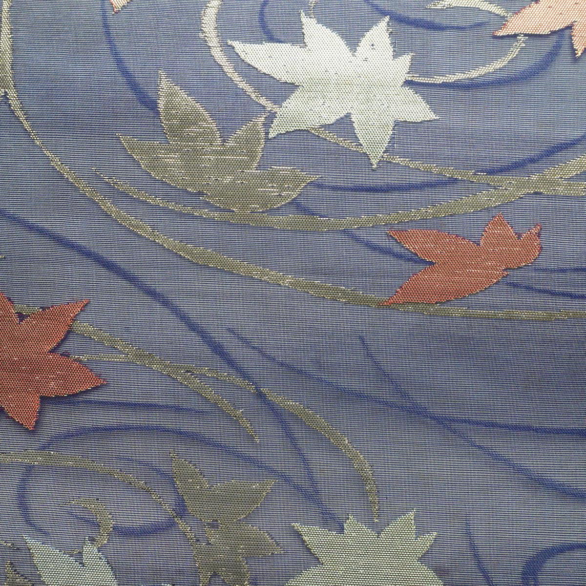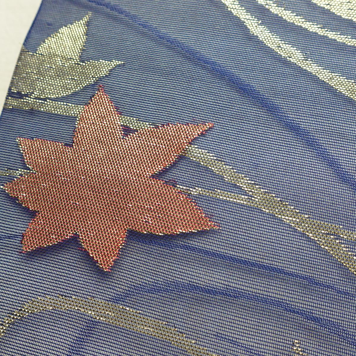 名古屋帯 六通柄 夏用 正絹 木の葉・植物柄 名古屋仕立て なごや帯 リサイクル帯 帯 紅葉 青・紺