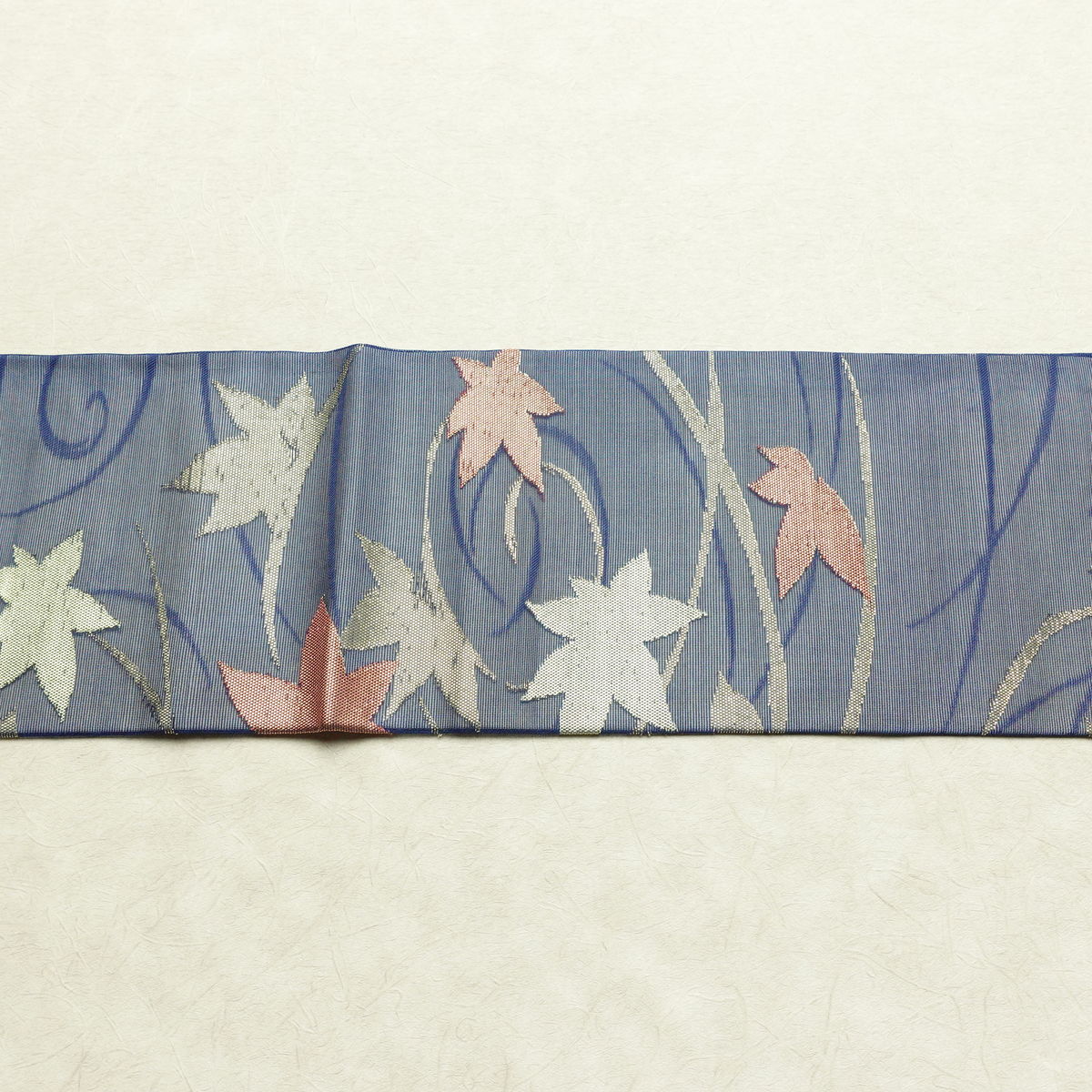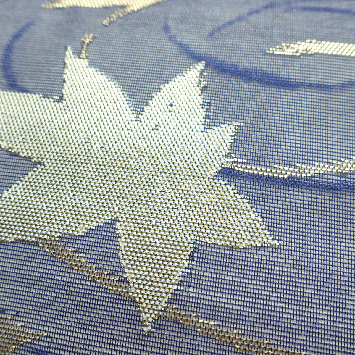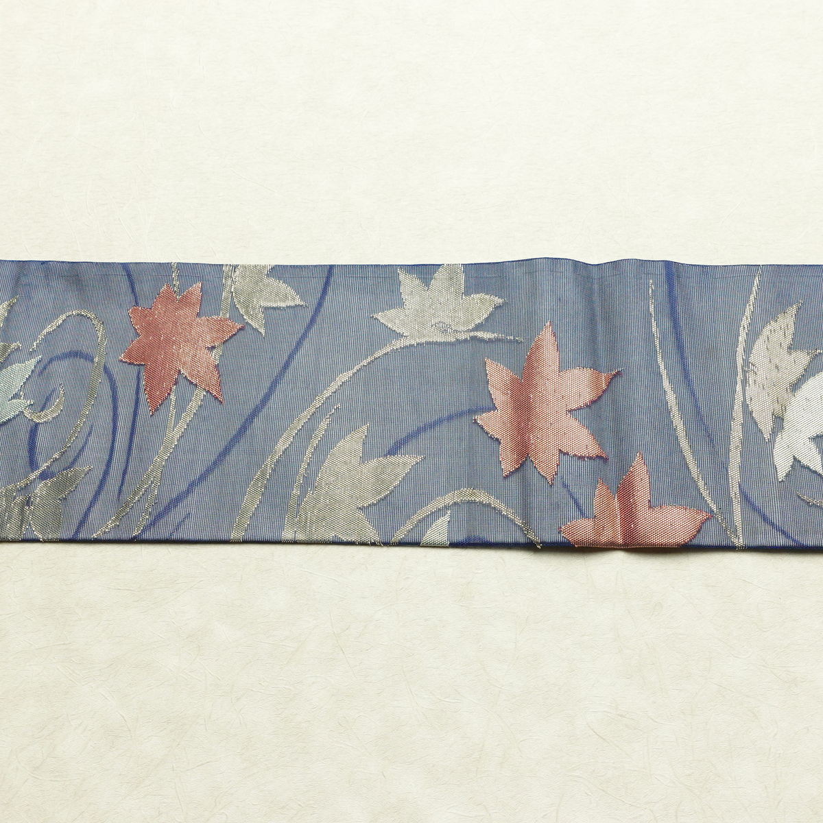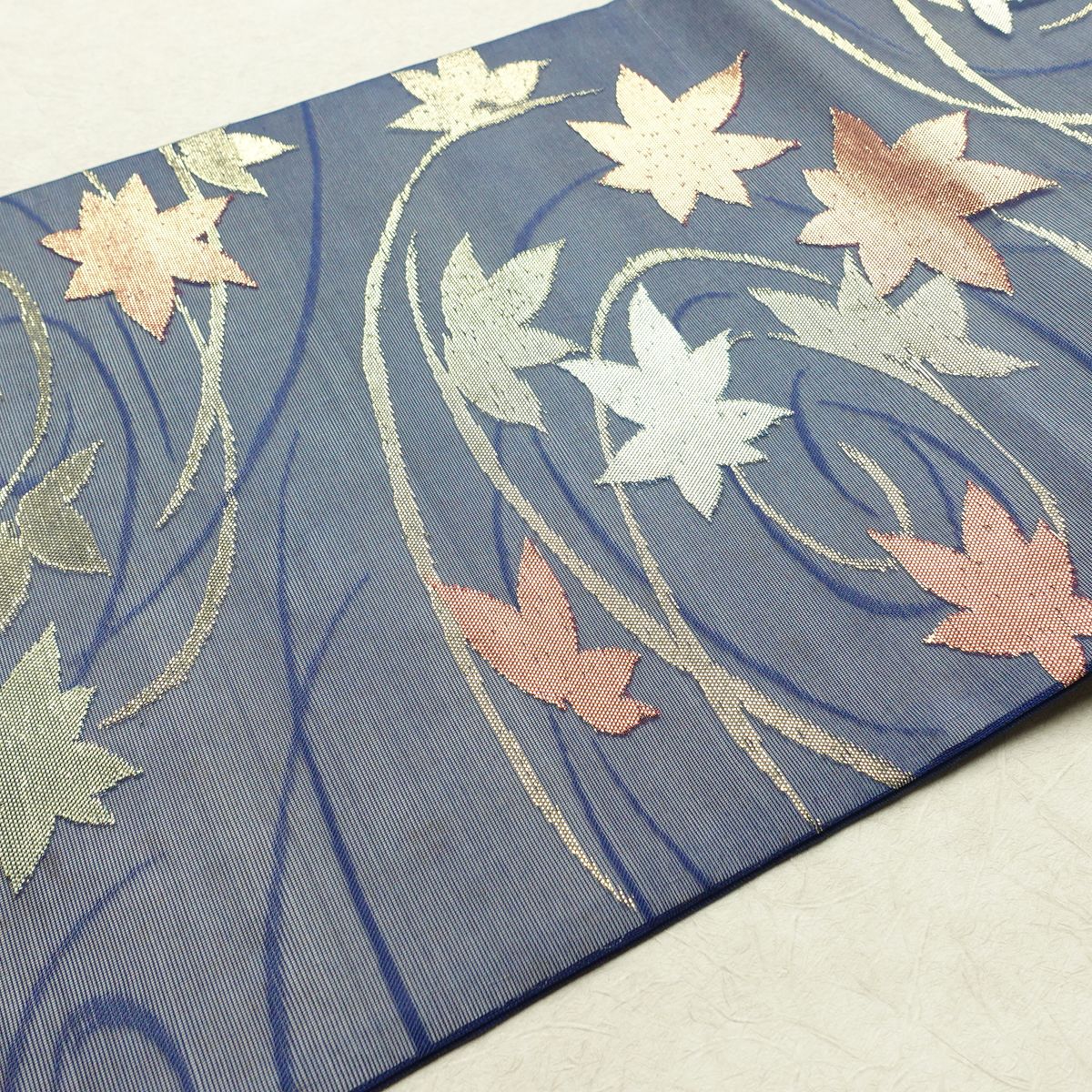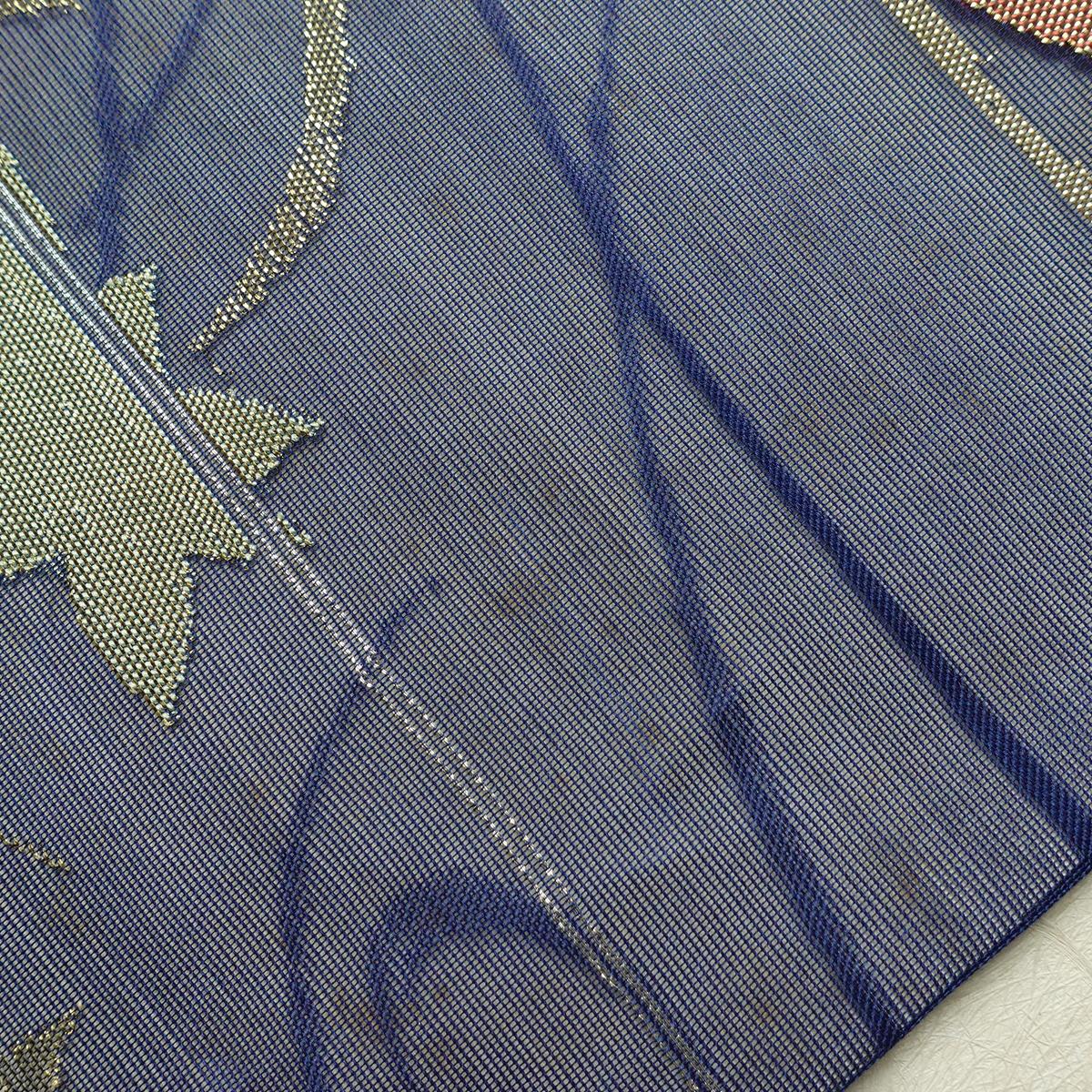 名古屋帯 六通柄 夏用 正絹 木の葉・植物柄 名古屋仕立て なごや帯 リサイクル帯 帯 紅葉 青・紺