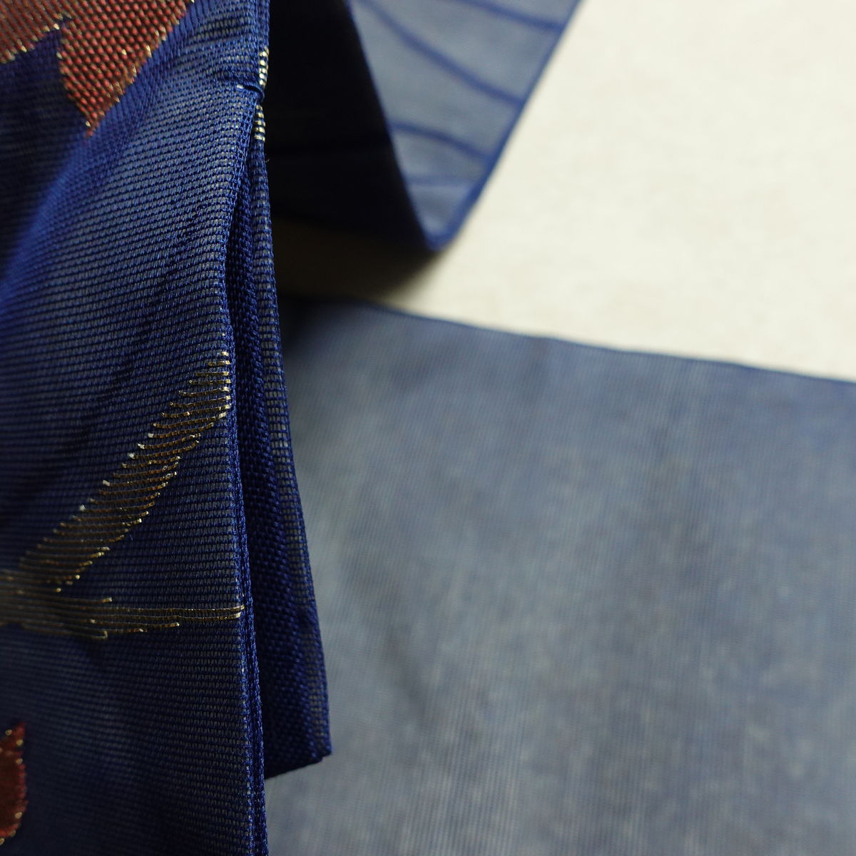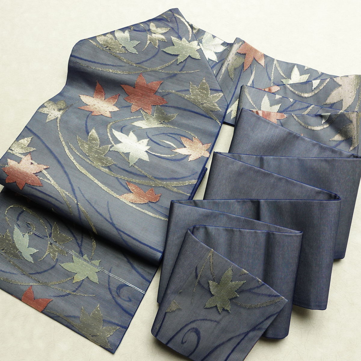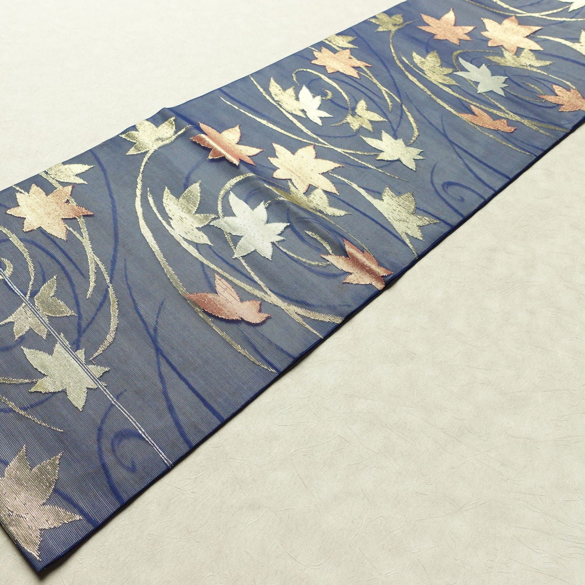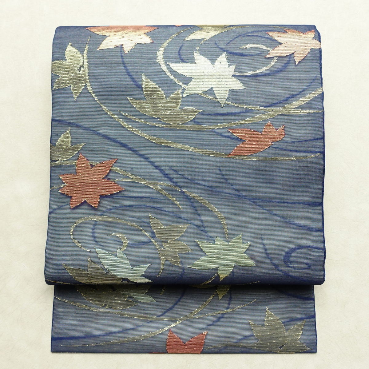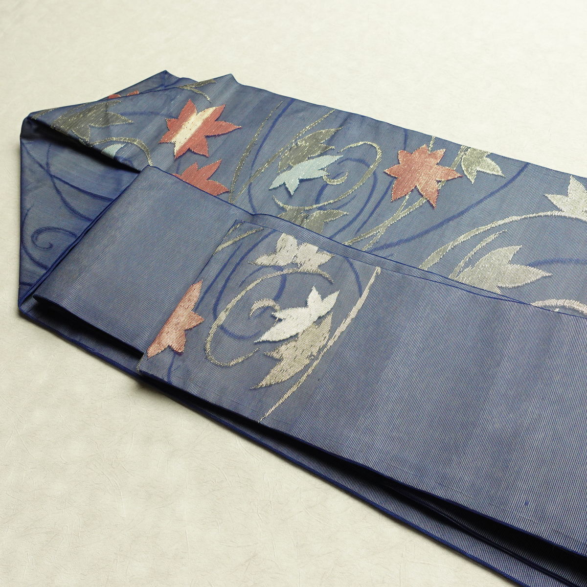 名古屋帯 六通柄 夏用 正絹 木の葉・植物柄 名古屋仕立て なごや帯 リサイクル帯 帯 紅葉 青・紺
