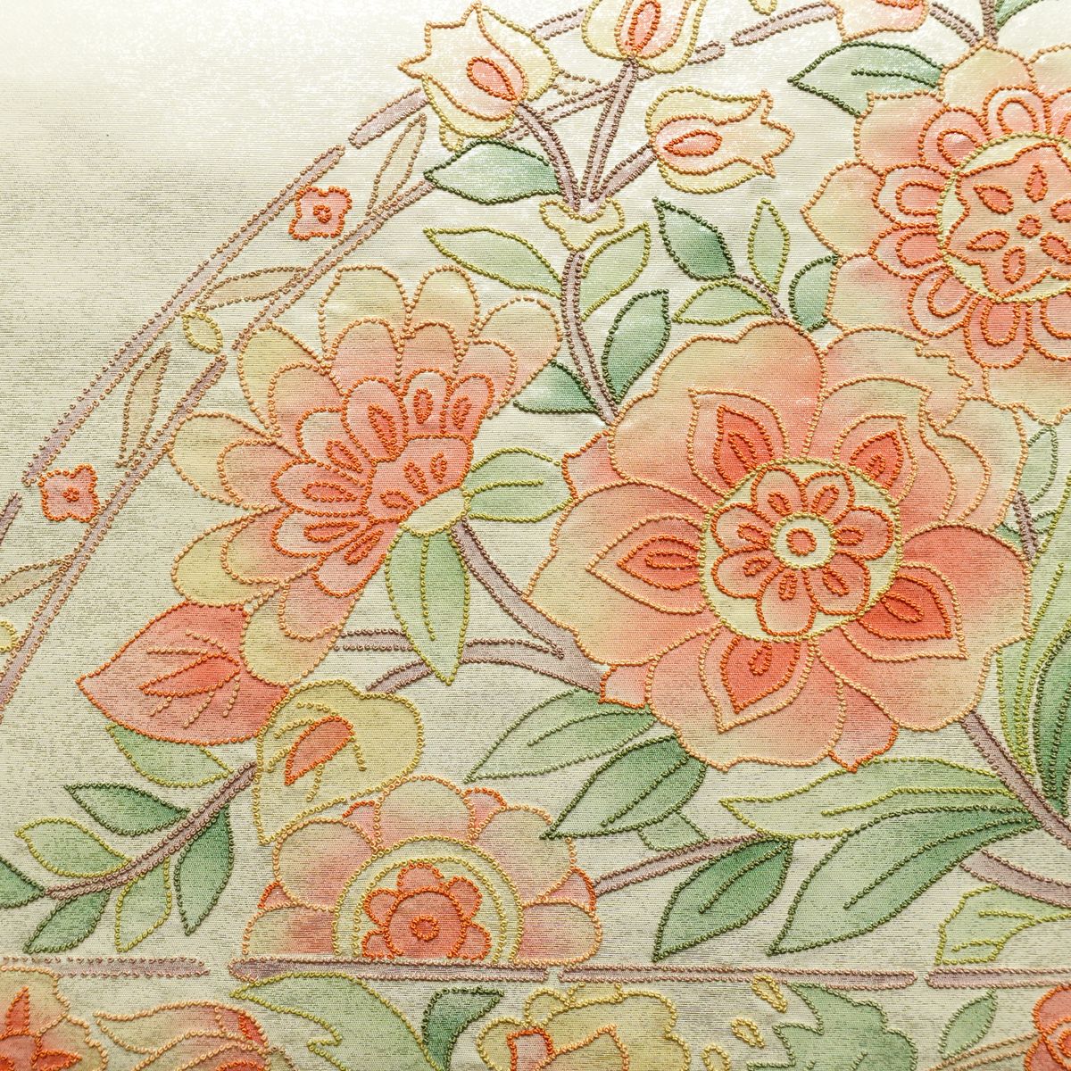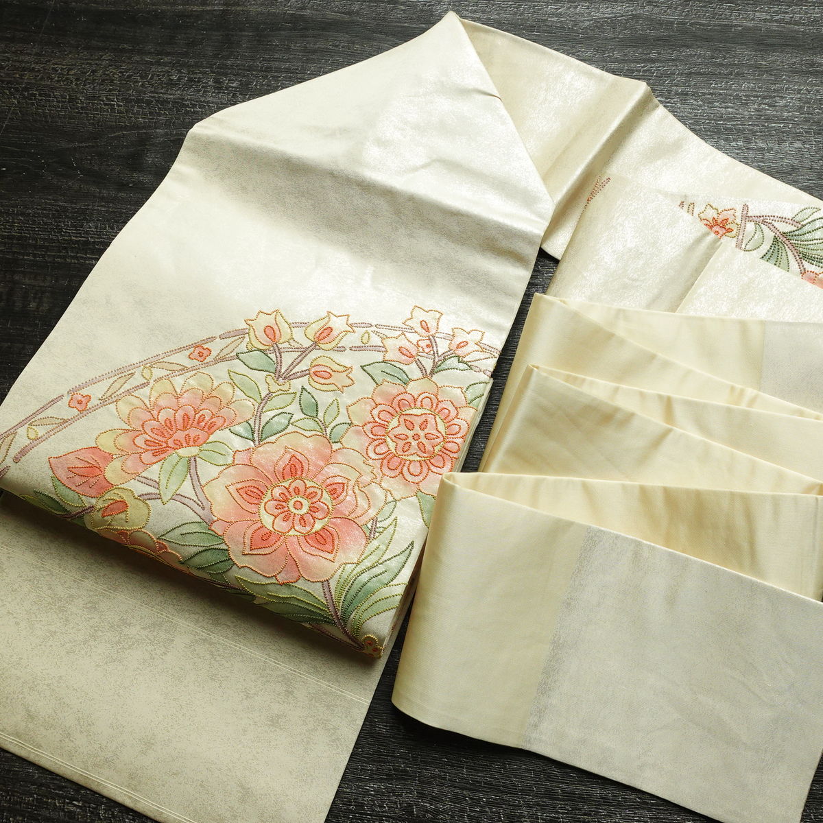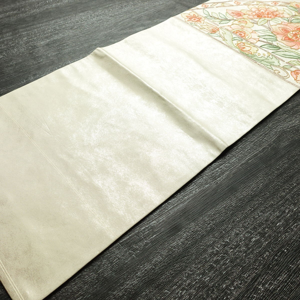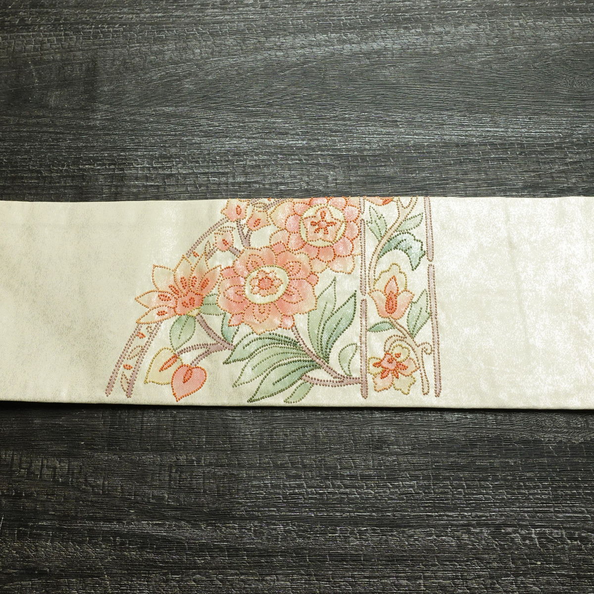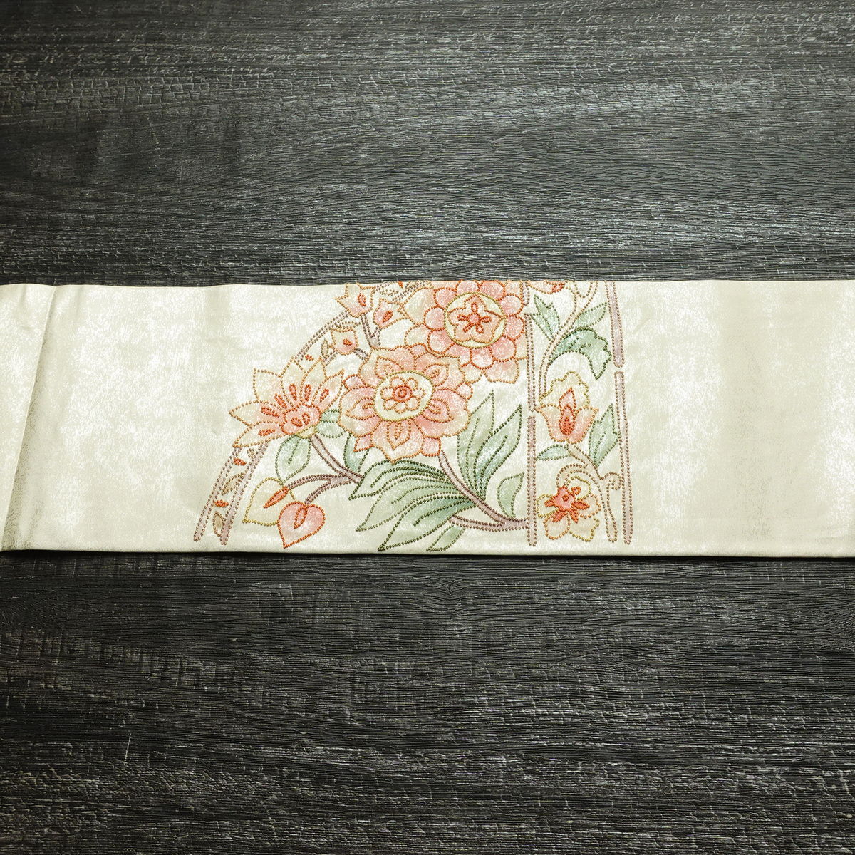 名古屋帯 太鼓柄 相良刺繍 正絹 花柄 名古屋仕立て なごや帯 リサイクル帯 帯 白