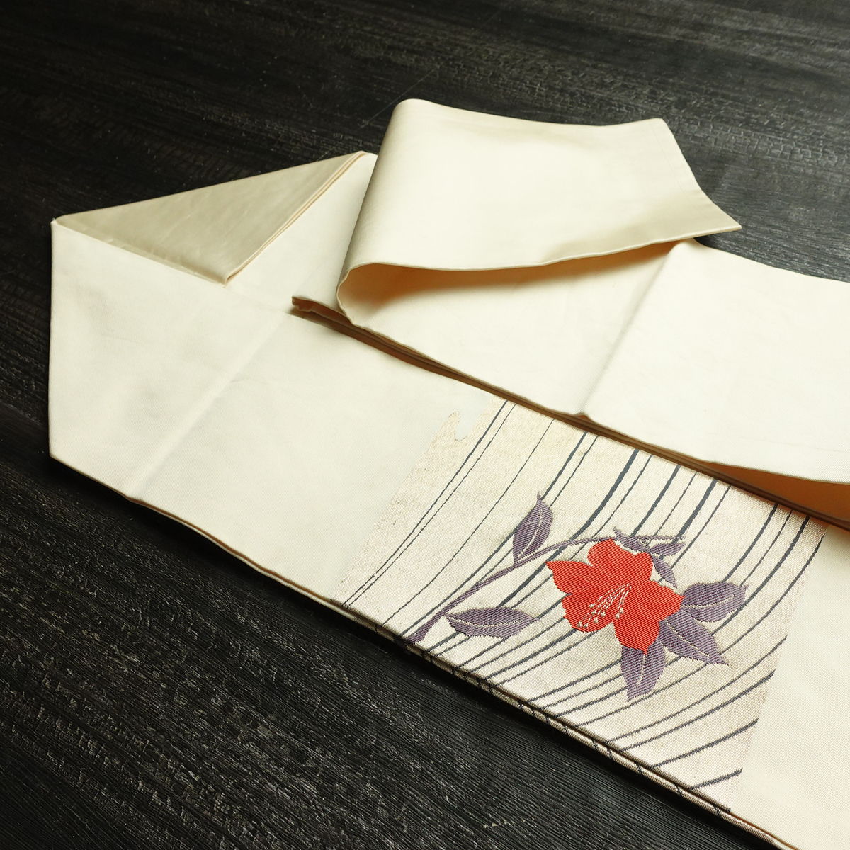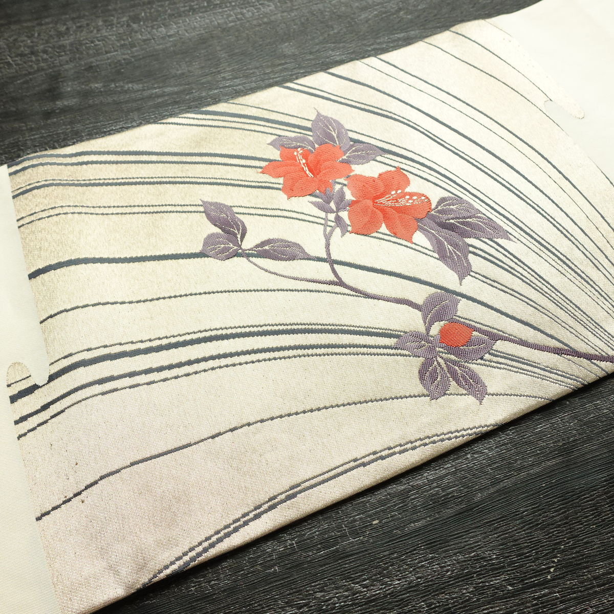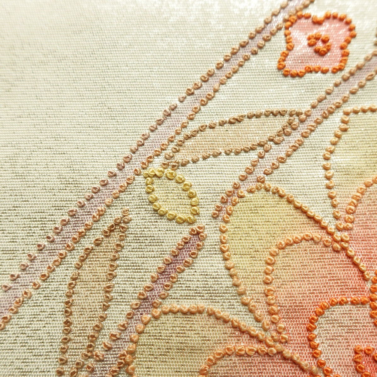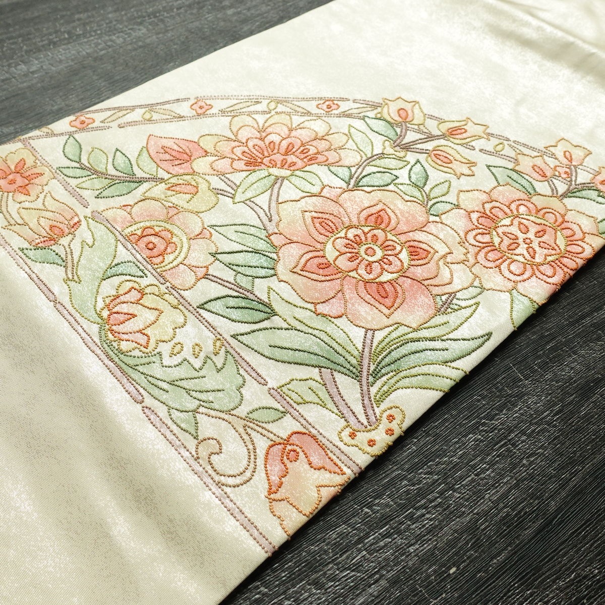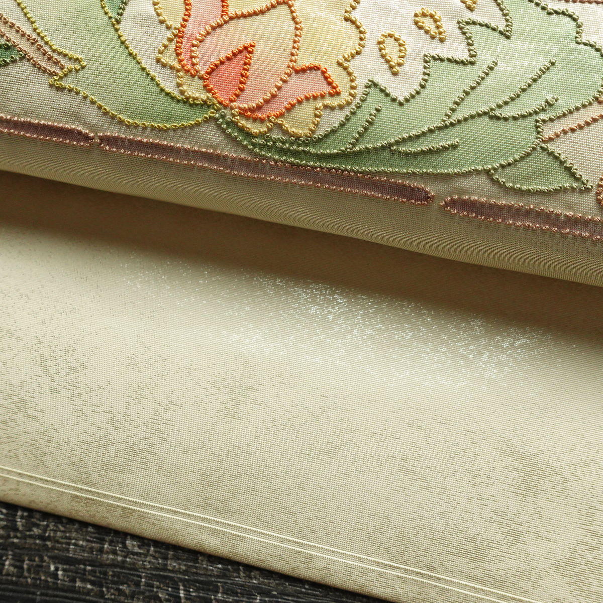 名古屋帯 太鼓柄 相良刺繍 正絹 花柄 名古屋仕立て なごや帯 リサイクル帯 帯 白