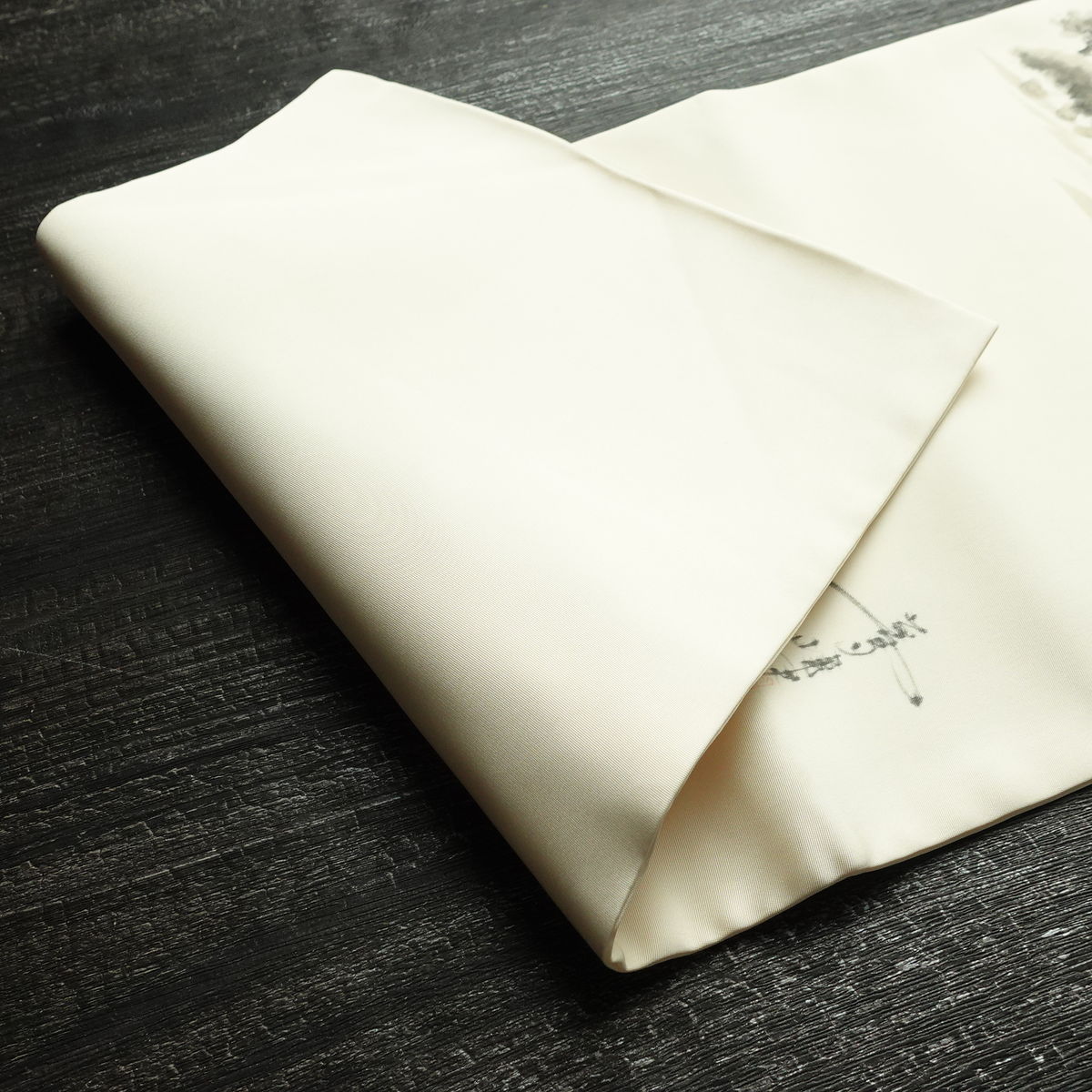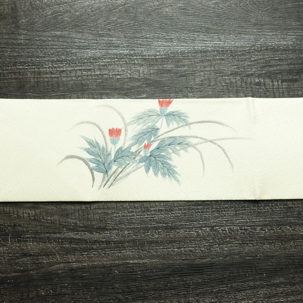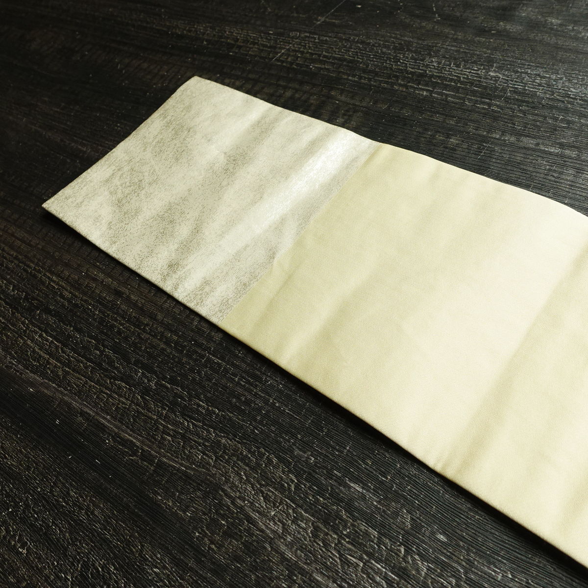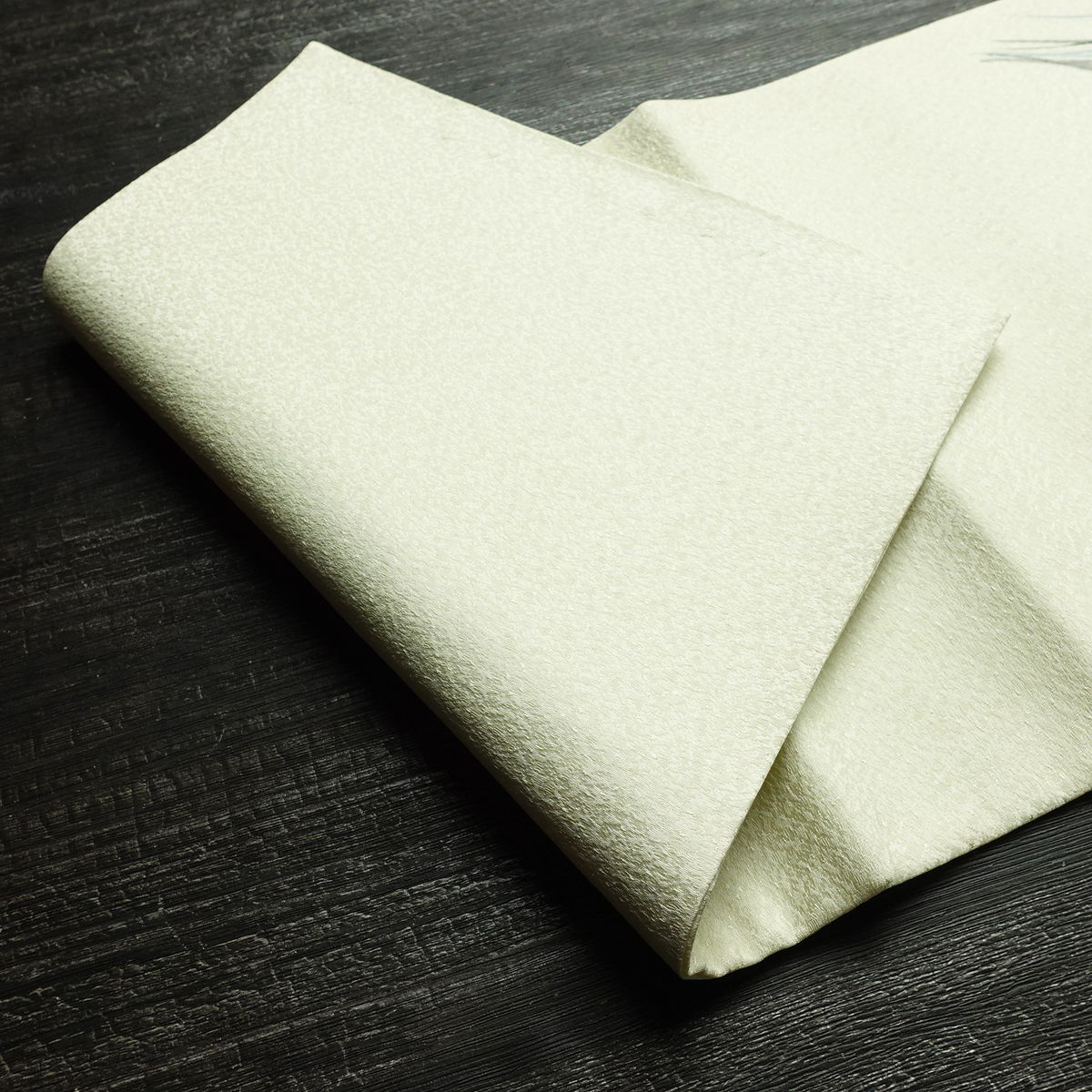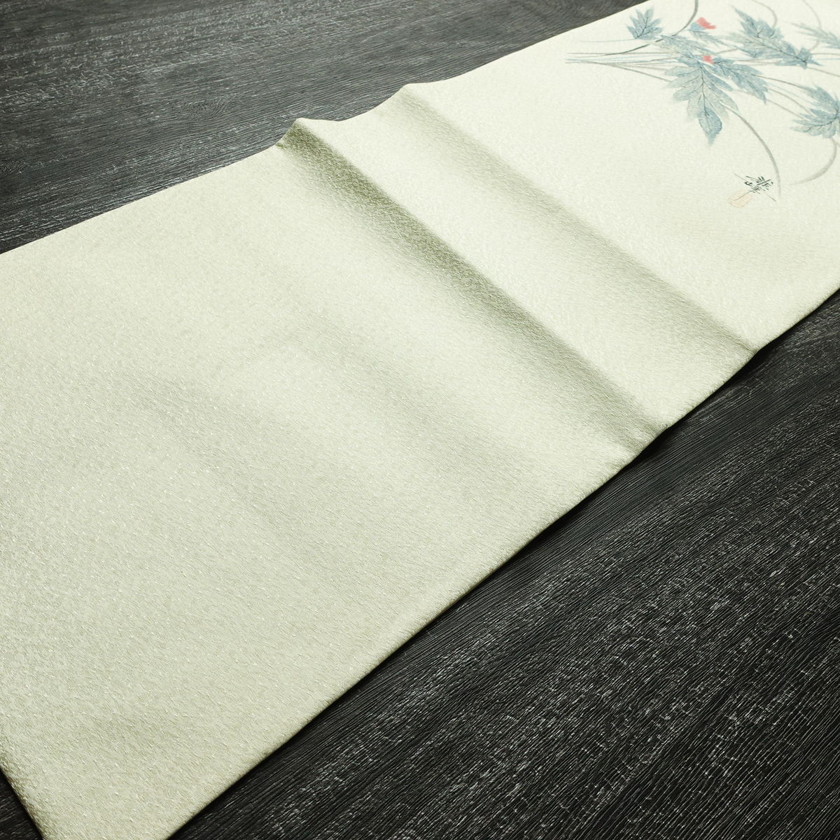 名古屋帯 太鼓柄 美品 落款入り 正絹 木の葉・植物柄 名古屋仕立て なごや帯 リサイクル帯 帯 白