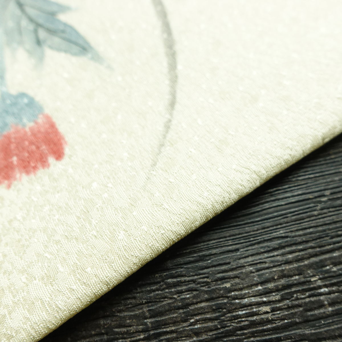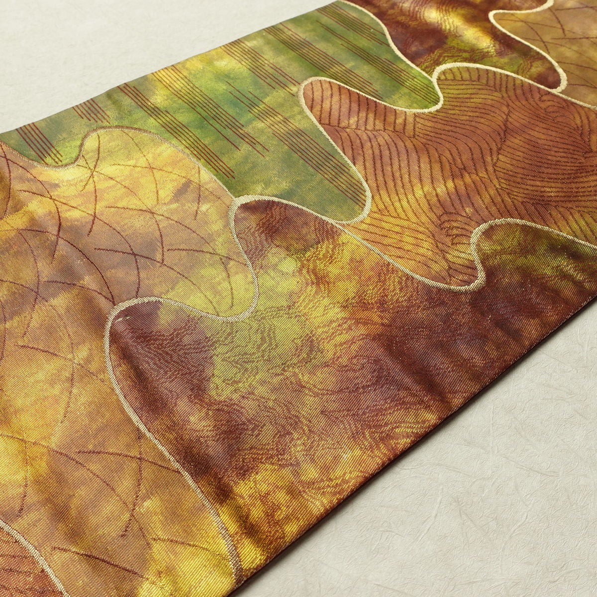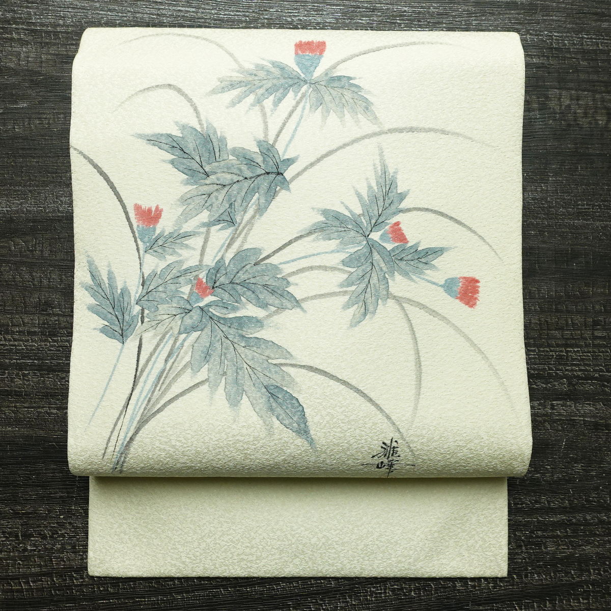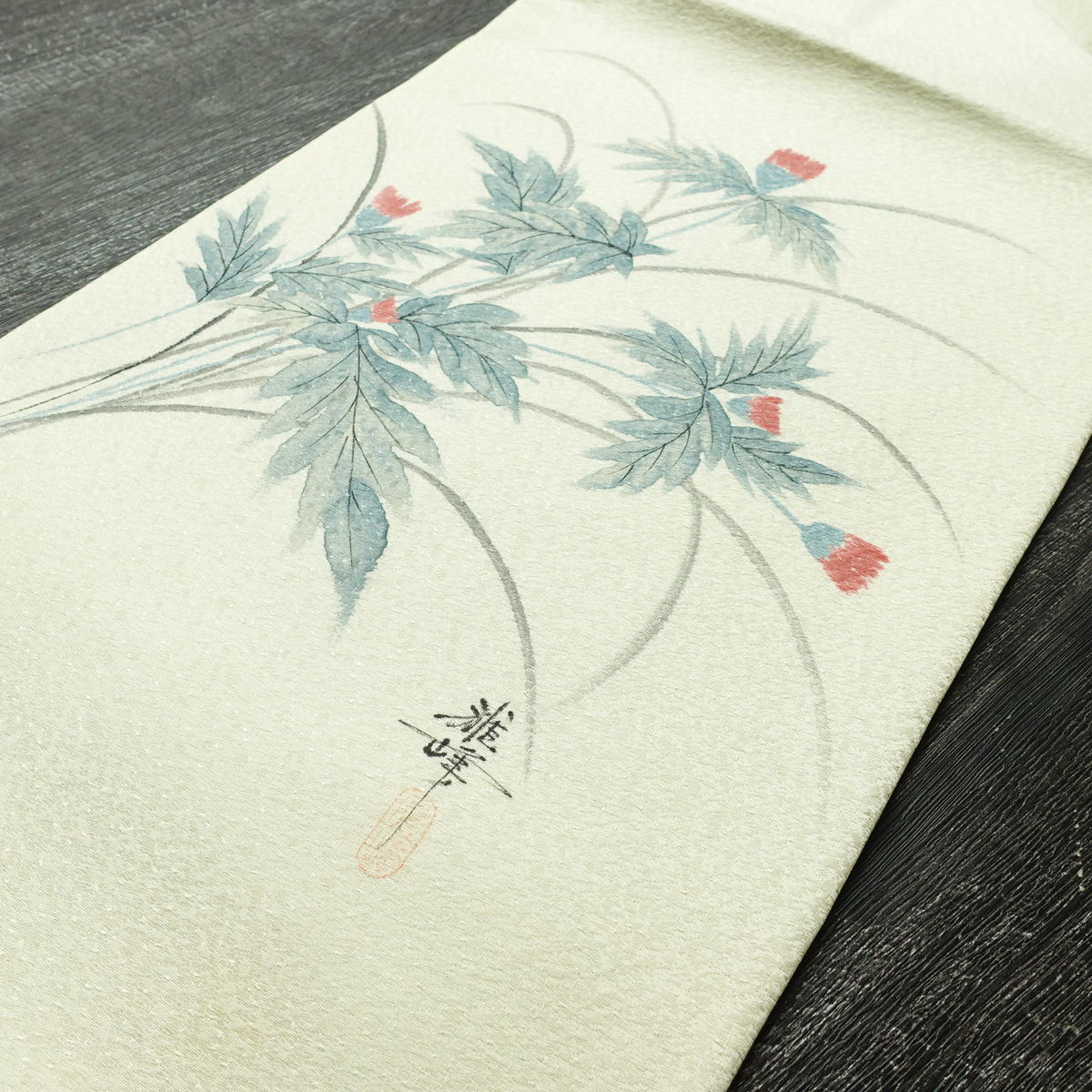 名古屋帯 太鼓柄 美品 落款入り 正絹 木の葉・植物柄 名古屋仕立て なごや帯 リサイクル帯 帯 白