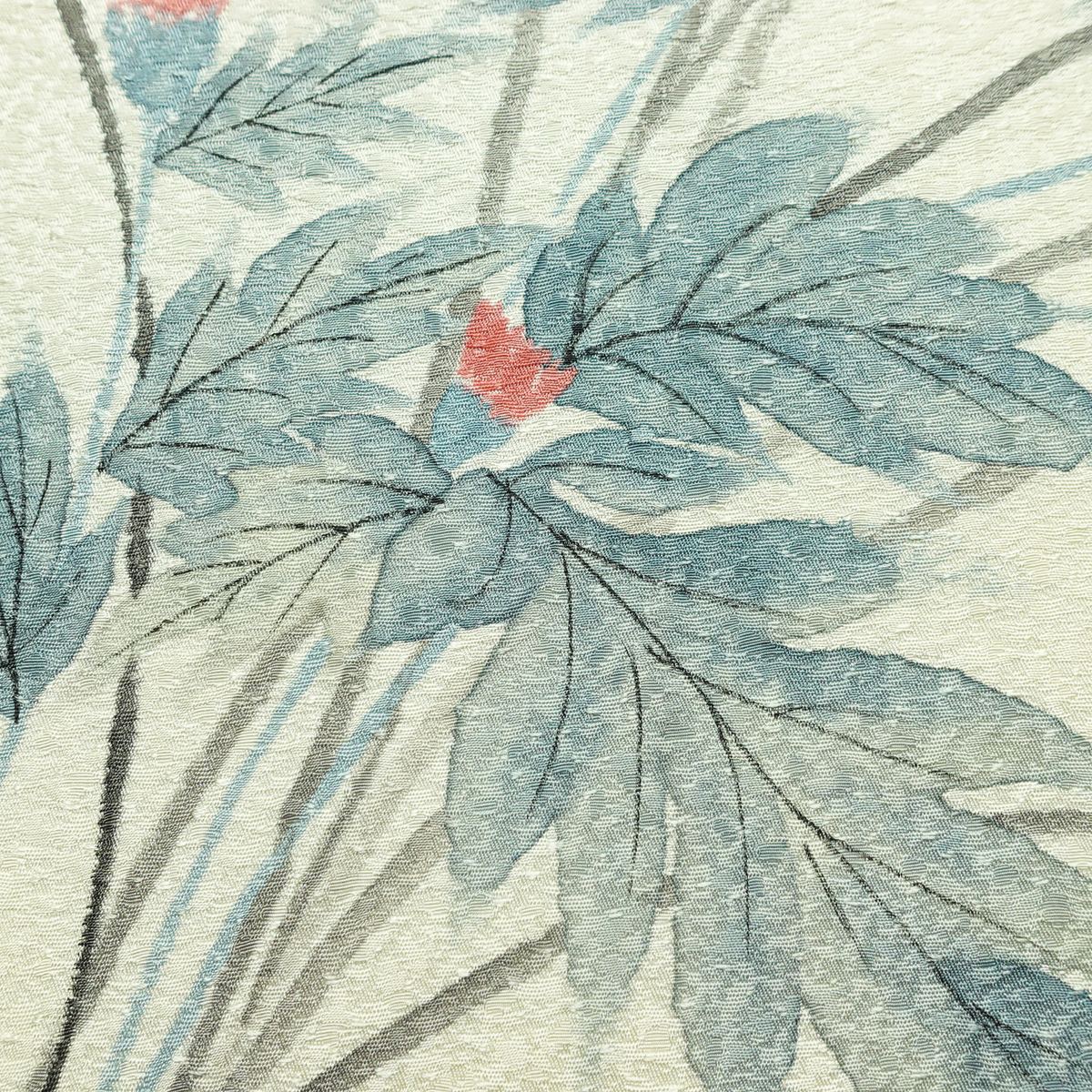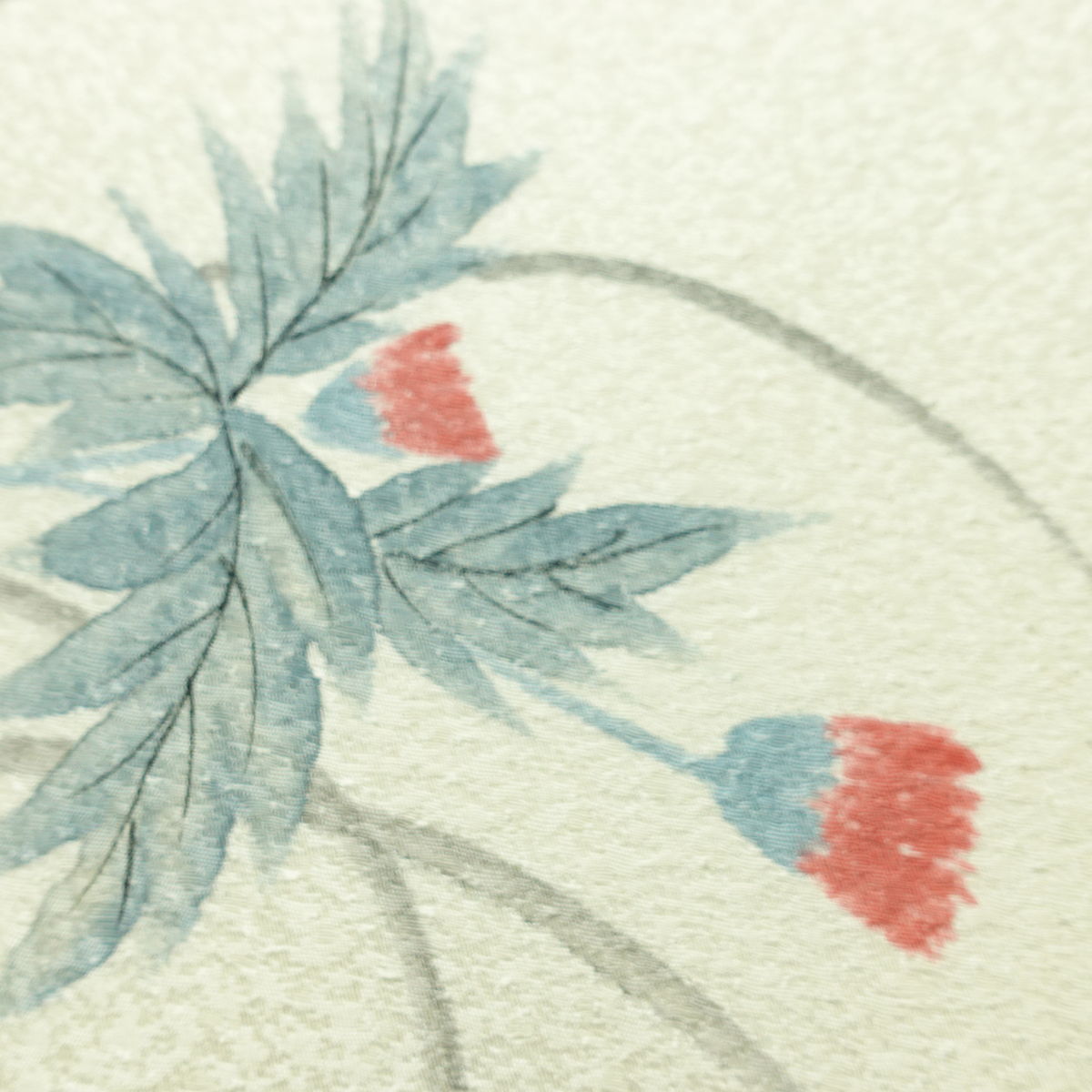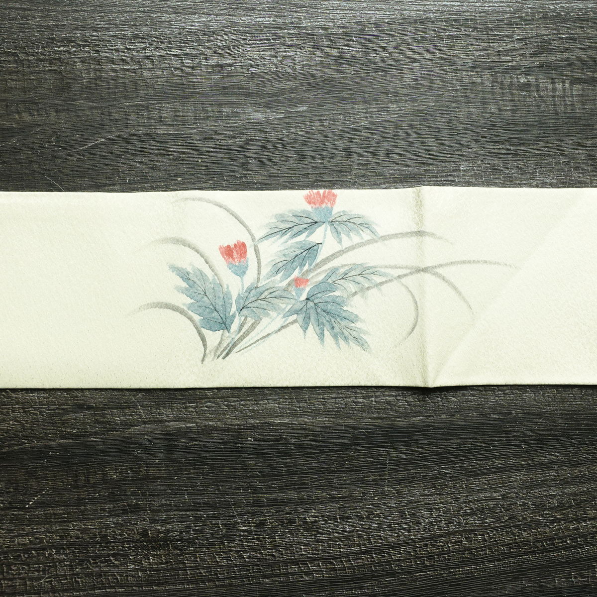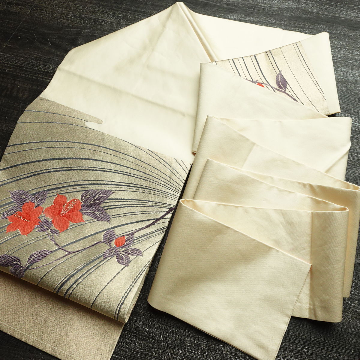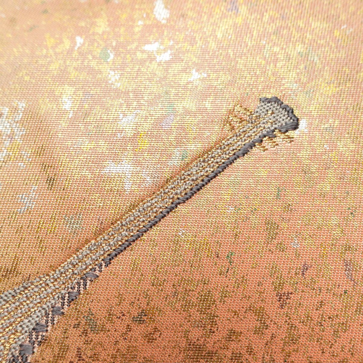 名古屋帯 太鼓柄 美品 落款入り 正絹 木の葉・植物柄 名古屋仕立て なごや帯 リサイクル帯 帯 白