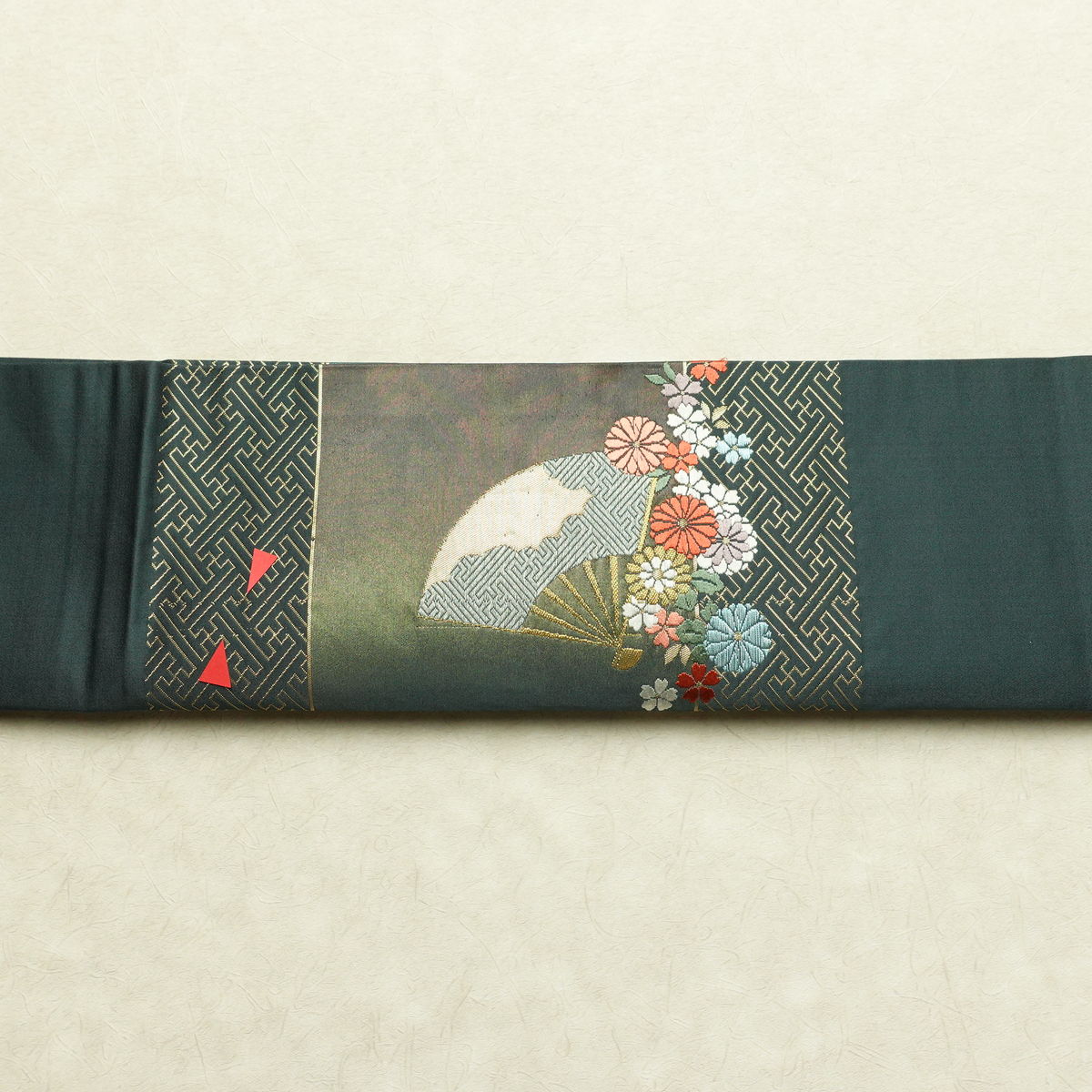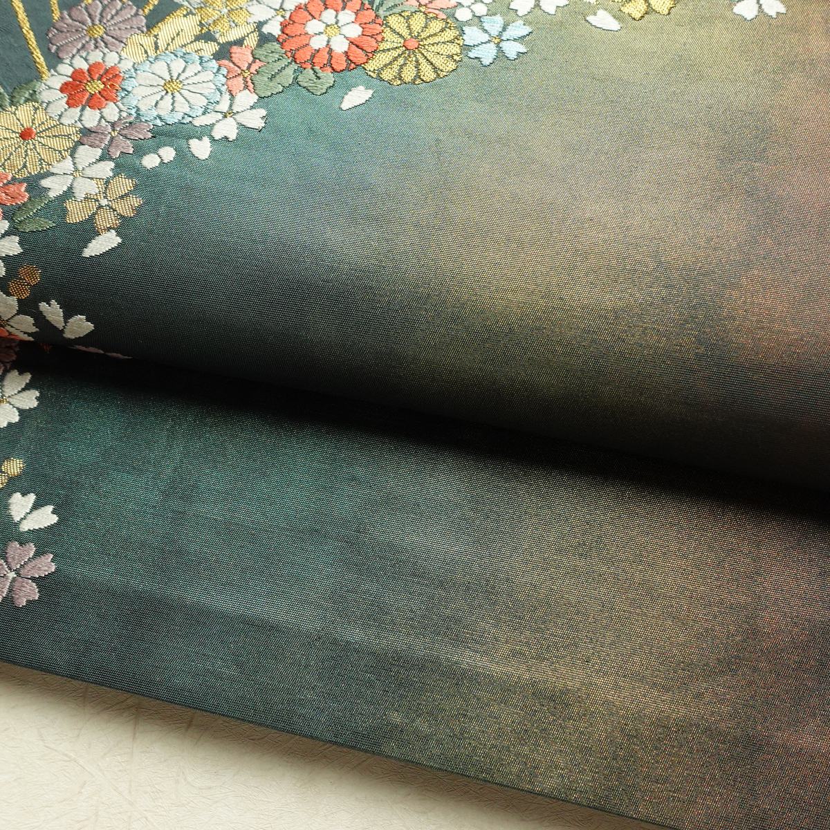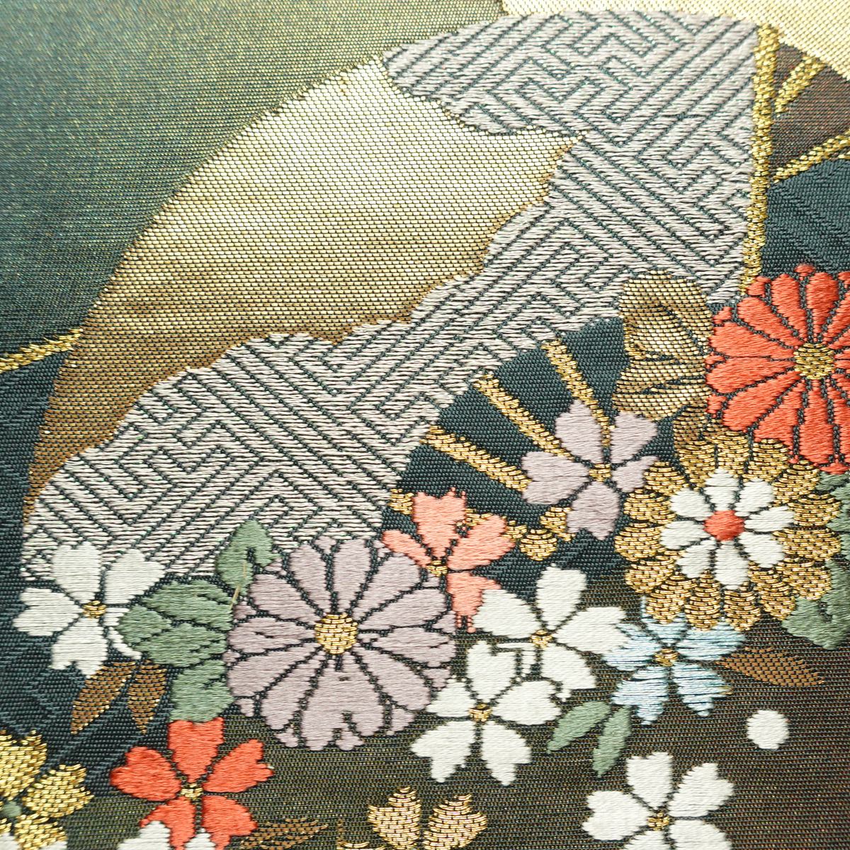 名古屋帯 太鼓柄 正絹 古典柄 通し仕立て なごや帯 リサイクル帯 帯 箔 緑・うぐいす色