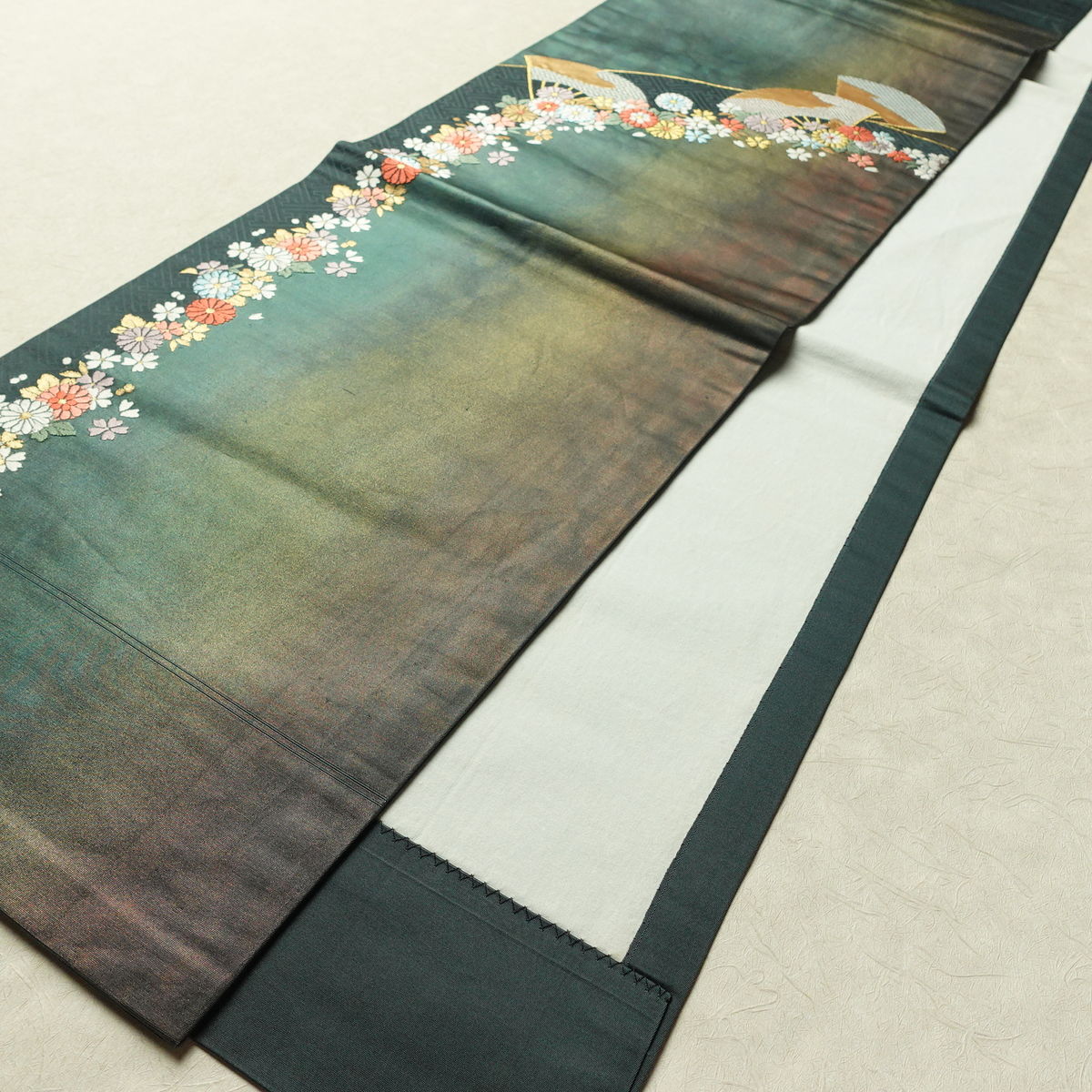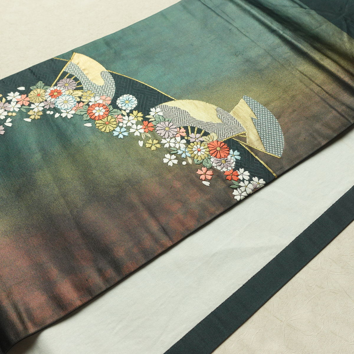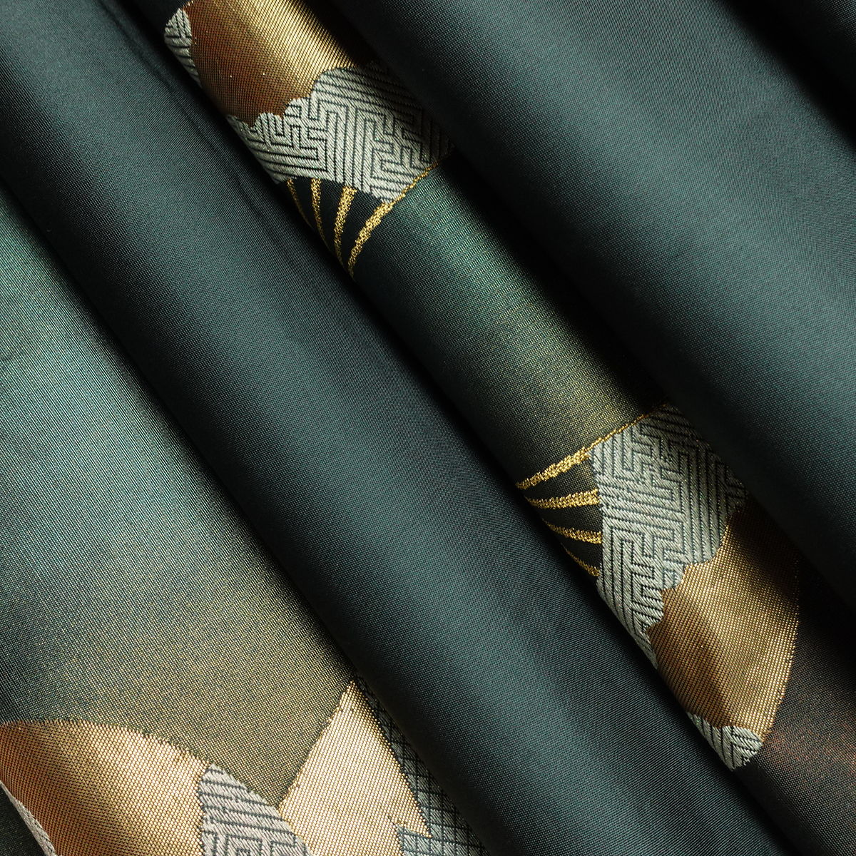 名古屋帯 太鼓柄 正絹 古典柄 通し仕立て なごや帯 リサイクル帯 帯 箔 緑・うぐいす色