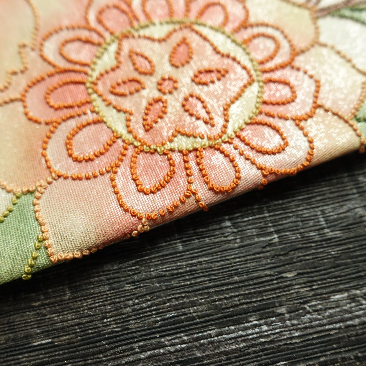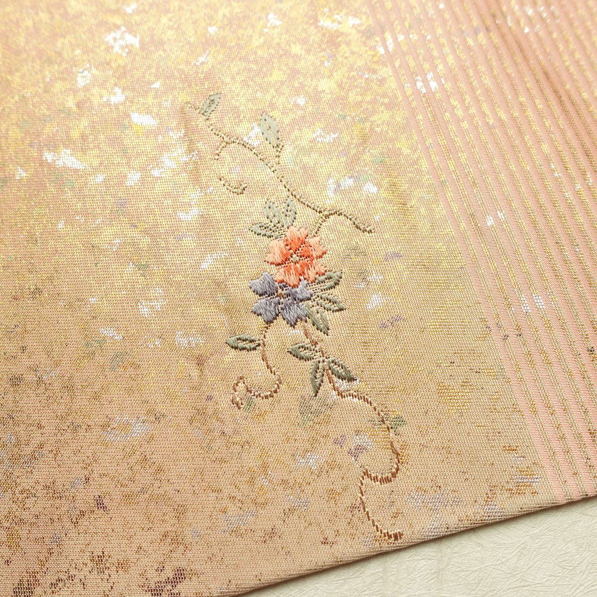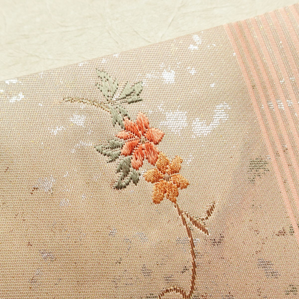 名古屋帯 太鼓柄 美品 正絹 花柄 名古屋仕立て なごや帯 リサイクル帯 帯 箔 菊 ピンク