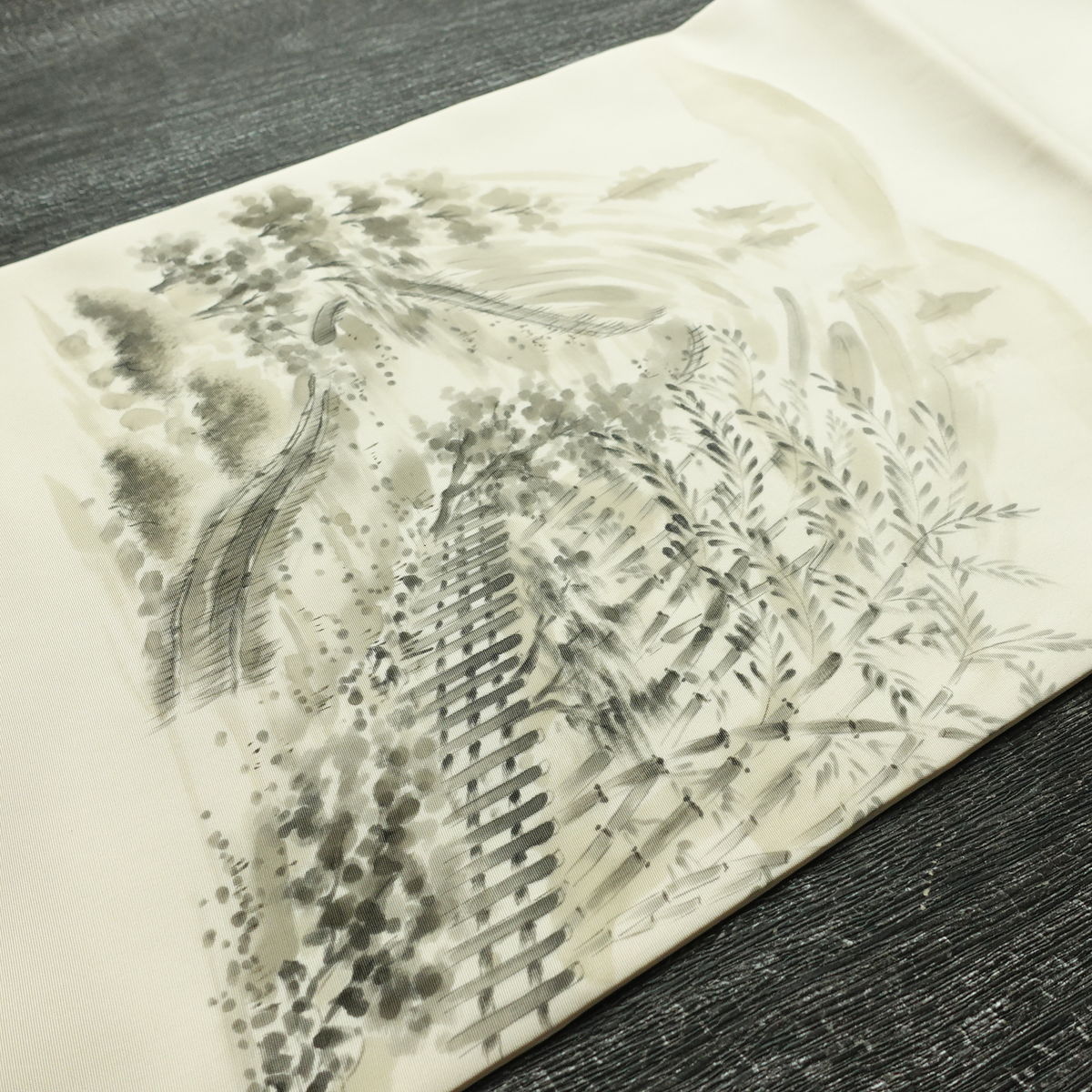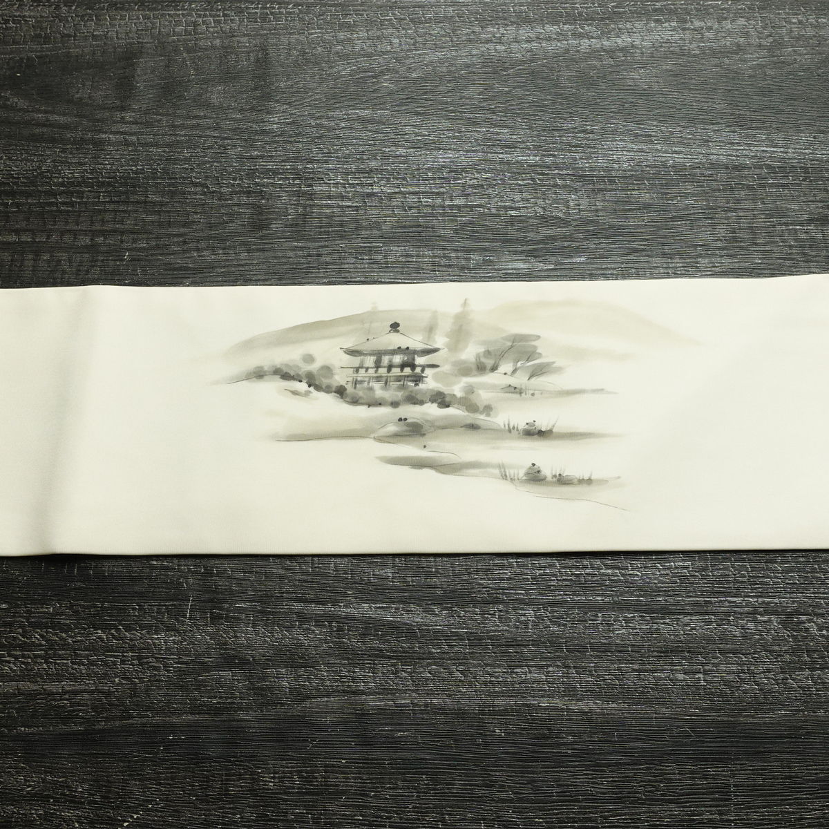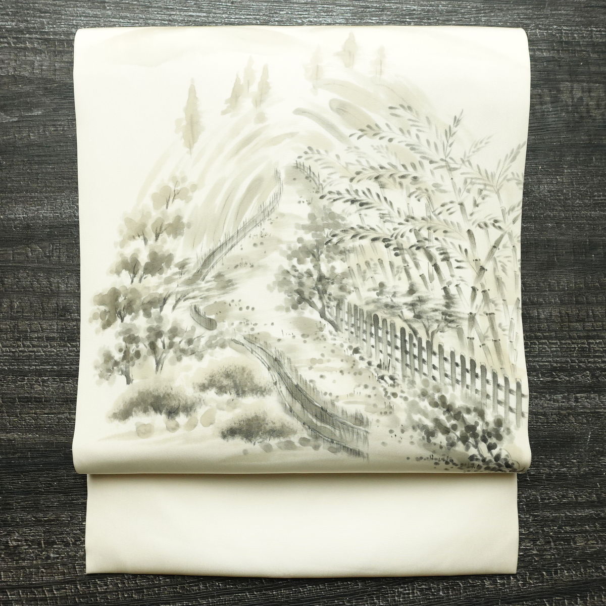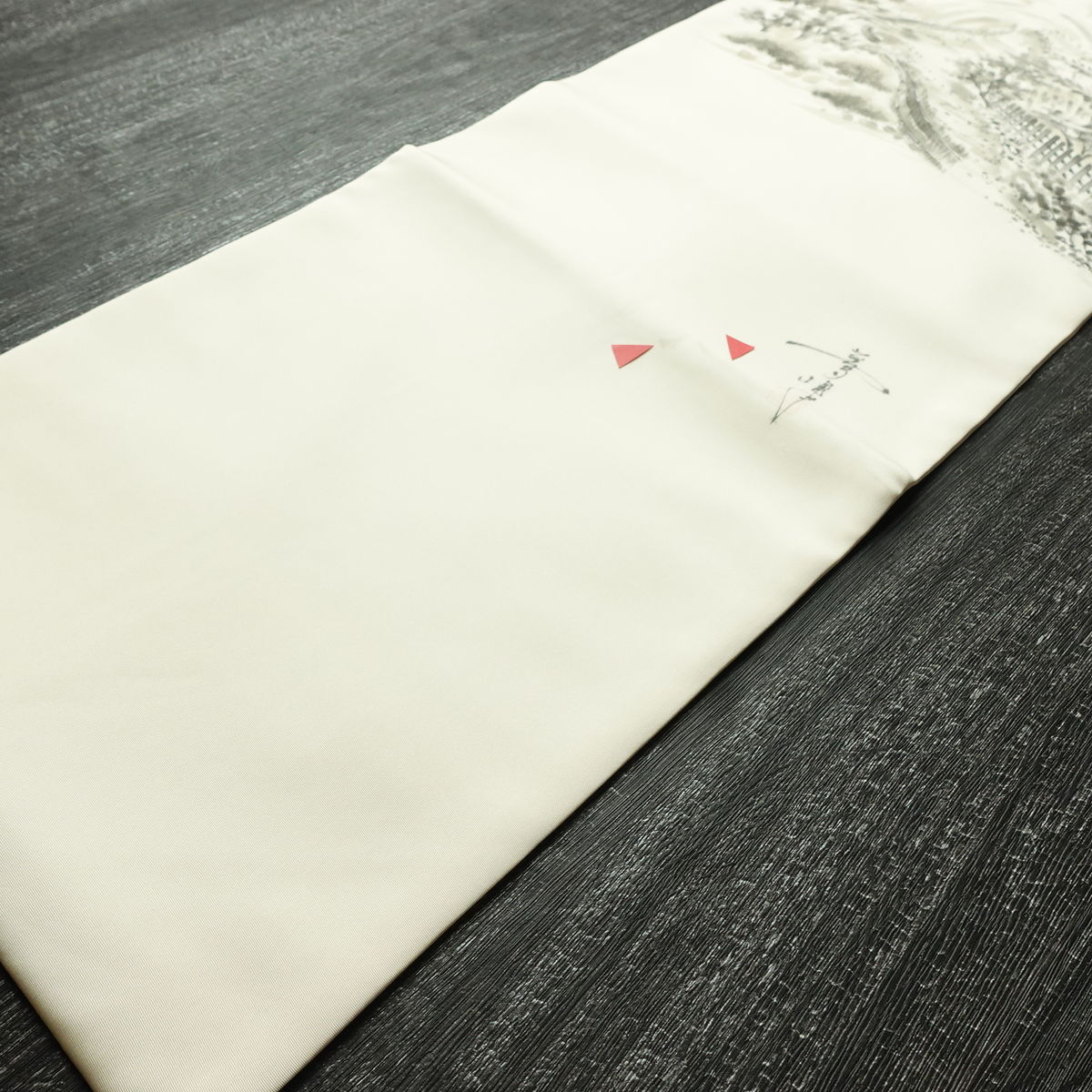 名古屋帯 太鼓柄 良品 落款入り 正絹 風景柄 名古屋仕立て なごや帯 リサイクル帯 帯 白